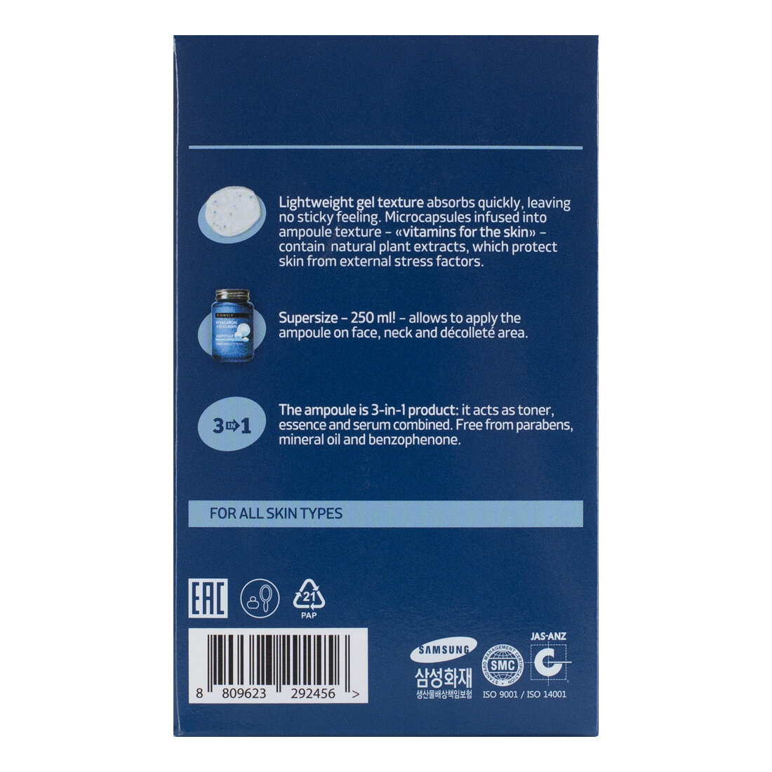 Описание товара:Многофункциональная укрепляющая ампульная сыворотка с гиалуроновой кислотой и коллагеном. Ампульная сыворотка с высоким содержанием активных компонентов интенсивно увлажняет и укрепляет кожу, препятствуя образованию морщин и других признаков старения. Гиалуроновая кислота, проникая в глубокие слои кожи, наполняет её влагой изнутри и создаёт на поверхности защитную плёнку, оберегающую от обезвоживания, снимает сухость и шелушения. Гидролизованный коллаген восстанавливает упругость и эластичность кожи, укрепляет её и продлевает молодость. Регулярное использование сыворотки сделает кожу гладкой и подтянутой. Лёгкая гелиевая текстура быстро впитывается, не перегружая кожу. Микрокапсулы в составе сыворотки - «витамины для кожи» содержатнатуральные растительные экстракты, которые помогают коже противостоять факторам внешнего стресса. Большой объем средства - 250 мл - позволяет использовать сыворотку на коже лица, шеи и в зоне декольте. Сыворотка - продукт 3-в-1: она совмещает свойства тонера, эссенции и сыворотки. Не содержит минерального масла, парабенов, и бензофенона.Состав товара:Water, hyaluronic acid, propylene glycol, glycerin, hydrolyzed collagen, lavandula angustifolia (lavender) extract, chamomilla recutita (matricaria) extract, hamamelis virginiana (witch hazel) extract, carbomer, triethanolamine, edta, xanthan gum, alcohol, phenoxyethanol, PEG-60 hydrogenated castor oil, lactose, microcrystalline cellulose, hydroxypropylcellulose, zanthoxylum piperitum fruit extract, pulsatilla koreana extract, usnea barbata (lichen) extract, titanium dioxide, sulfur, allantoin, ultramarines, fragrance, butylphenyl methylpropional, linalool, limonene.Меры предосторожности:Избегать попадания в глаза, в случае возникновения раздражения прекратить использование.Способ применения:При помощи ложечки, находящейся внутри упаковки, возьмите необходимое количество сыворотки, нанесите на кожу лица и распределите лёгкими массирующими движениями. Используйте утром и вечером после очищения кожи.