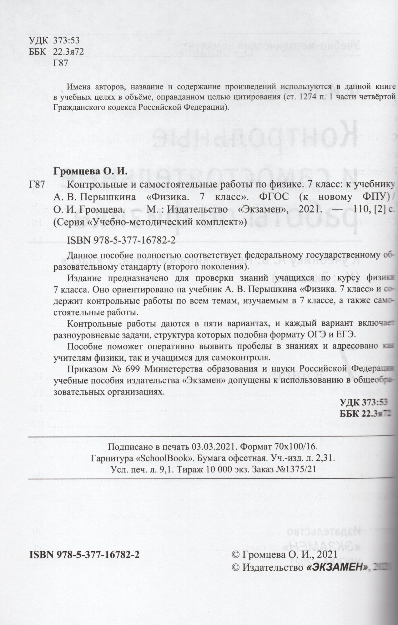 Физика. 7 класс. Контрольные и самостоятельные работы к учебнику А.В. Перышкина. ФПУ (Громцева Ольга Ильинична); Экзамен, 2021