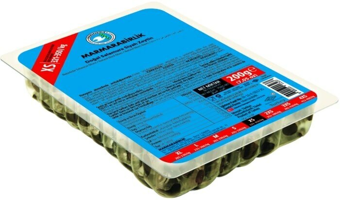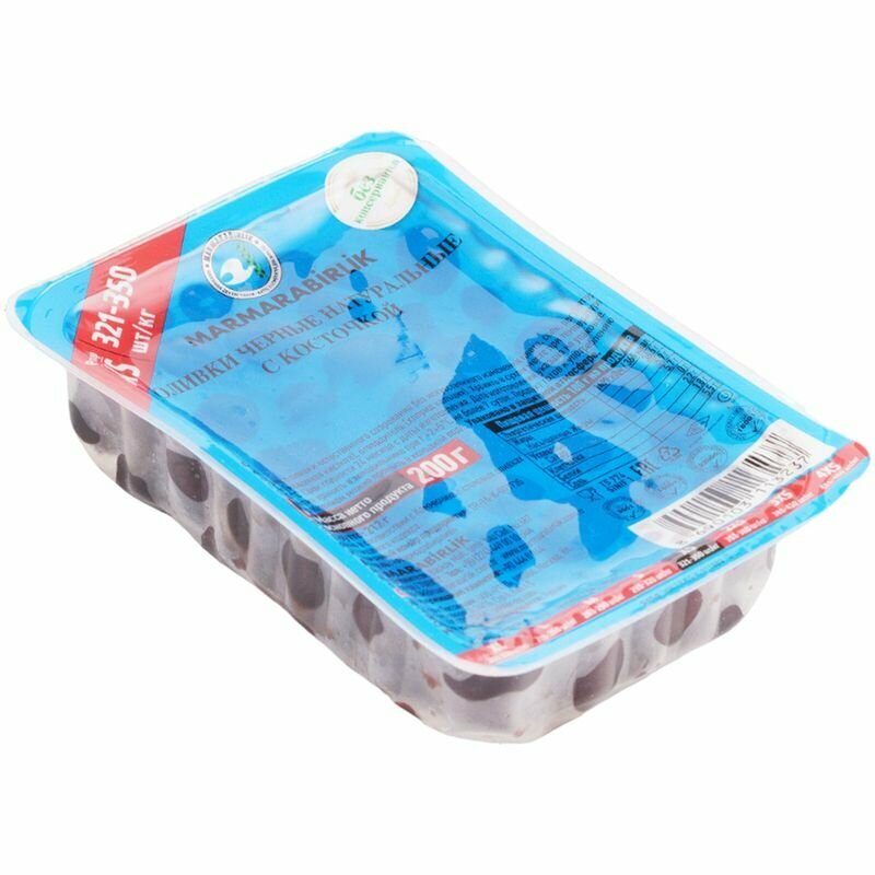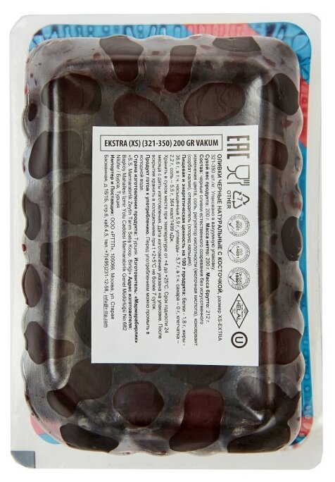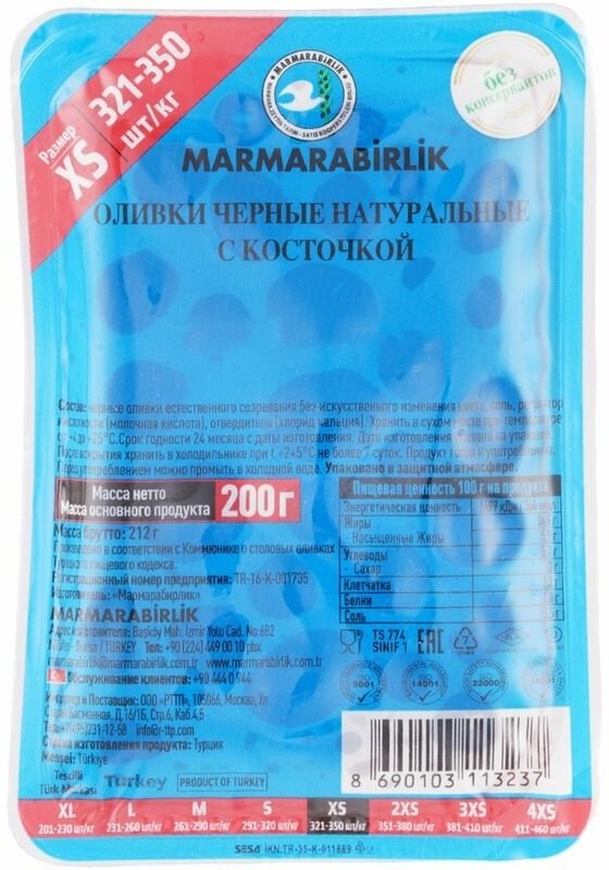 Состав: черные оливки естественного созревания без искусственного изменения цвета, соль, регулятор кислотности (молочная кислота), консервант (сорбат калия), отвердитель (хлорид кальция)