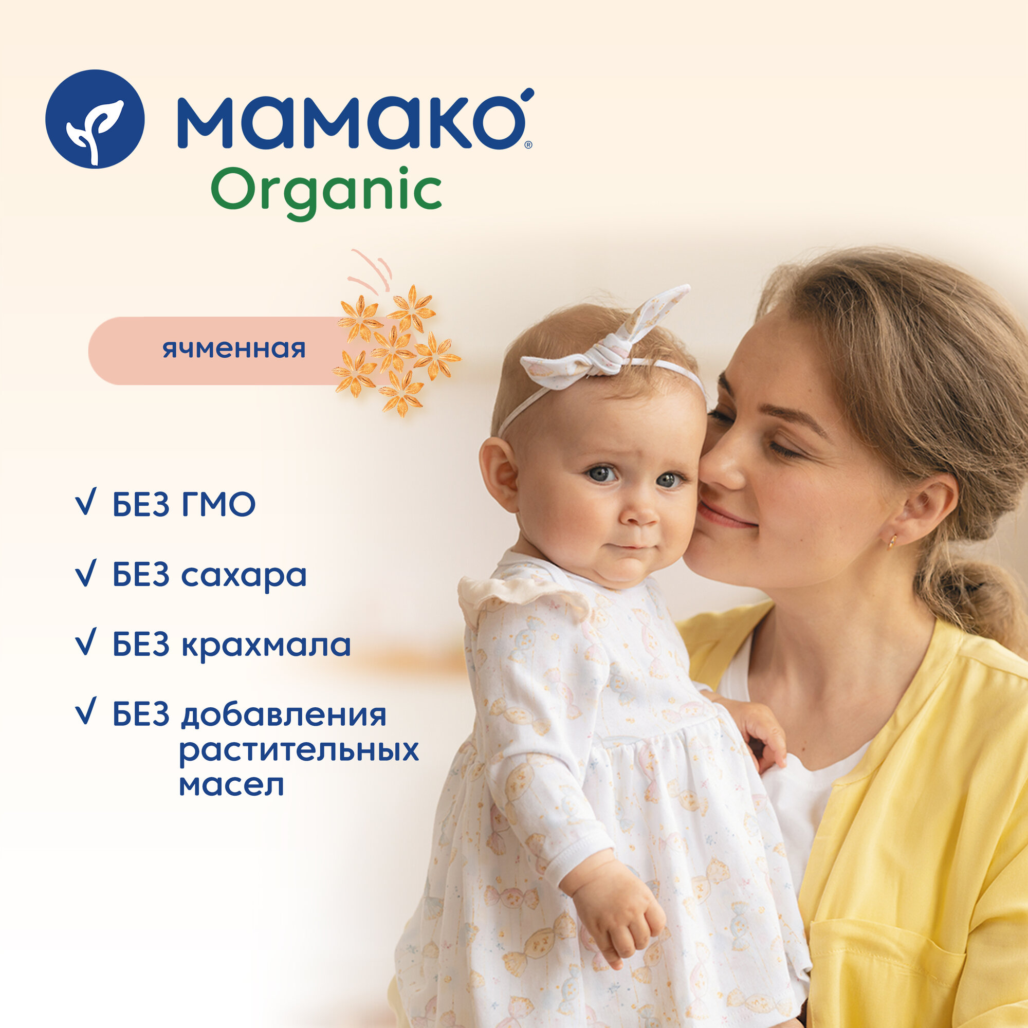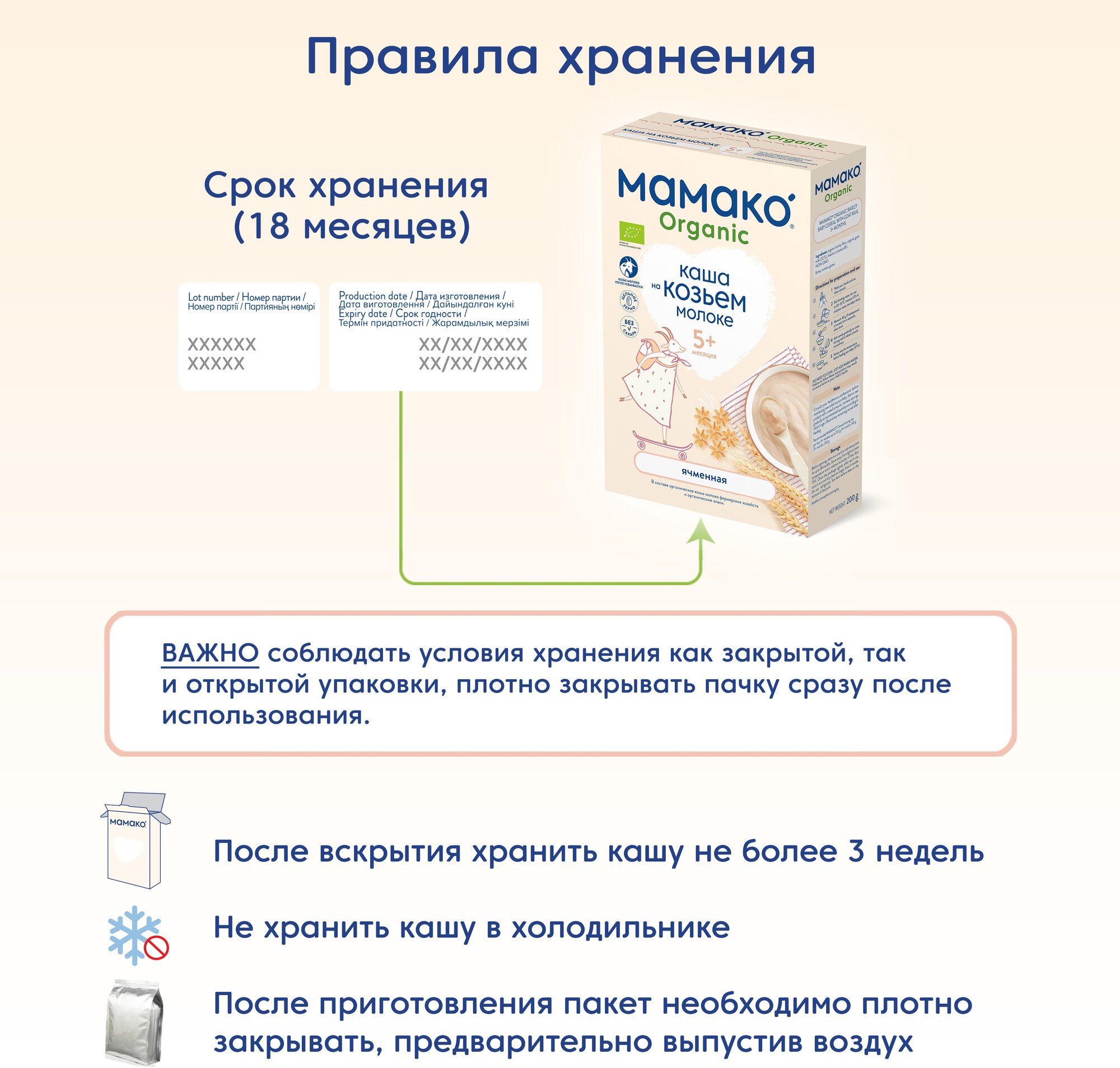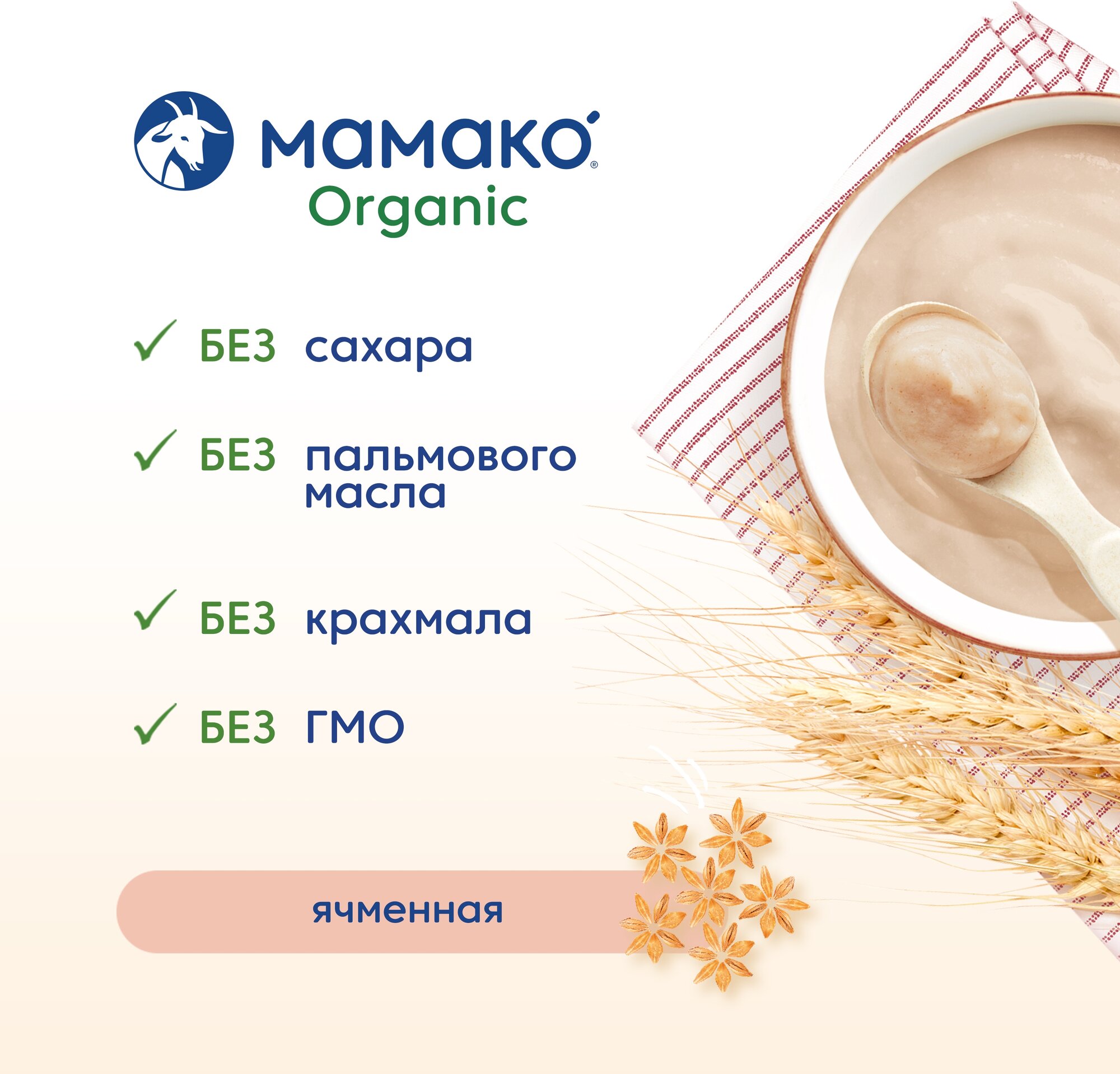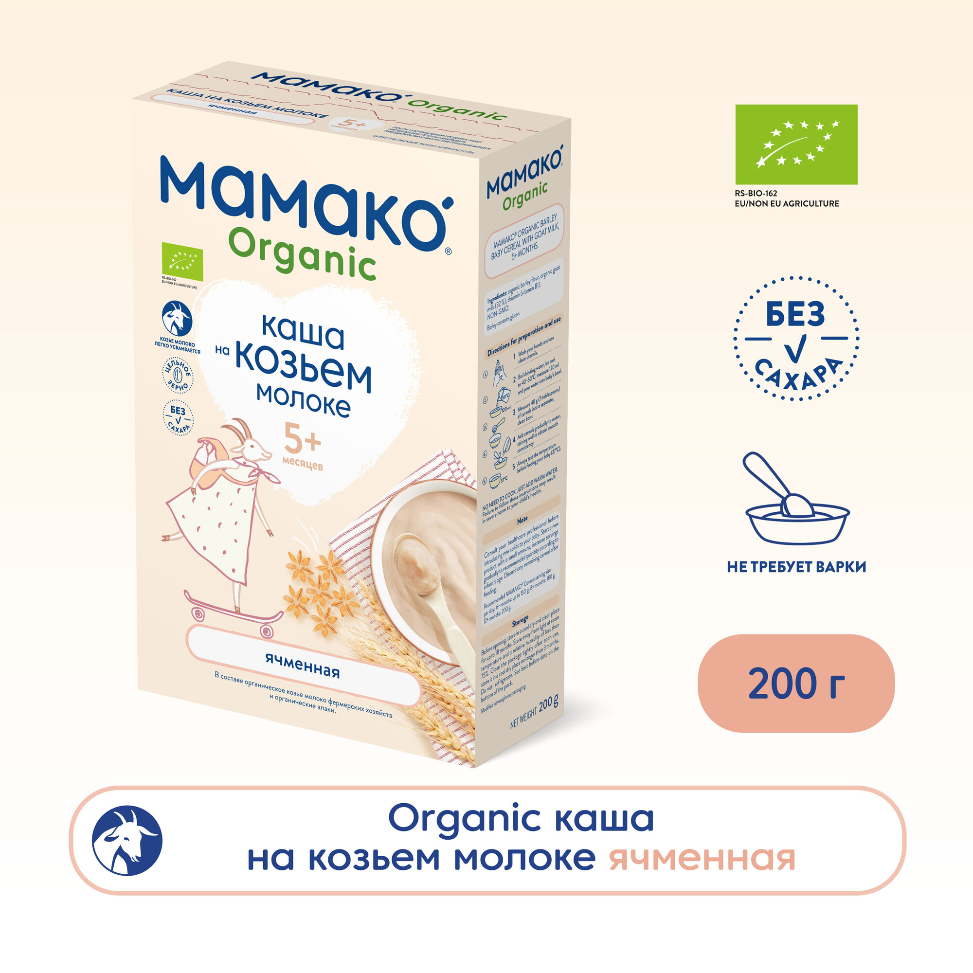 Продукт детского питания для детей раннего возраста, продукт прикорма, органический продукт, сухая быстрорастворимая молочная каша MAMAKO ORGANIC ячменная на козьем молоке для питания детей старше 5 месяцев.