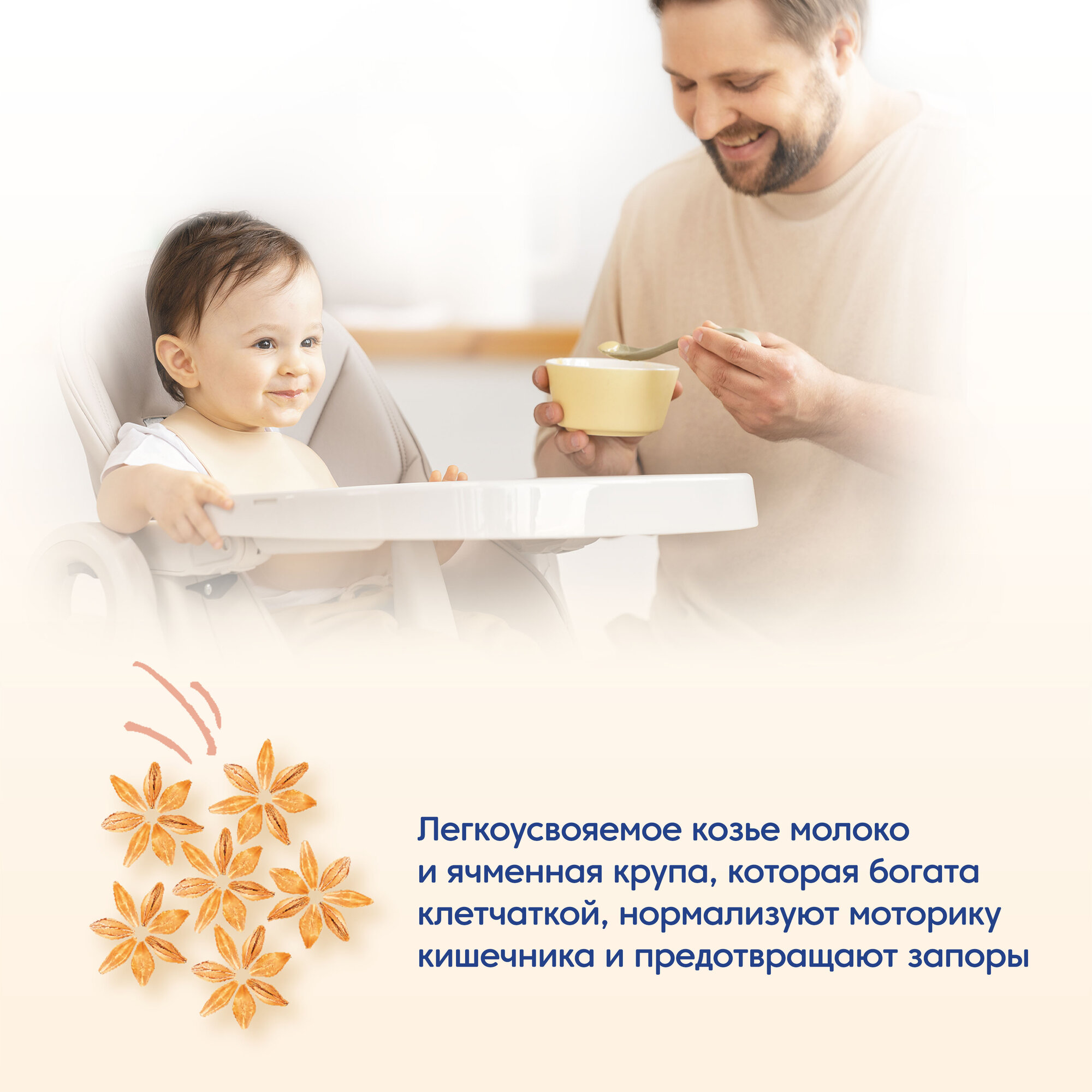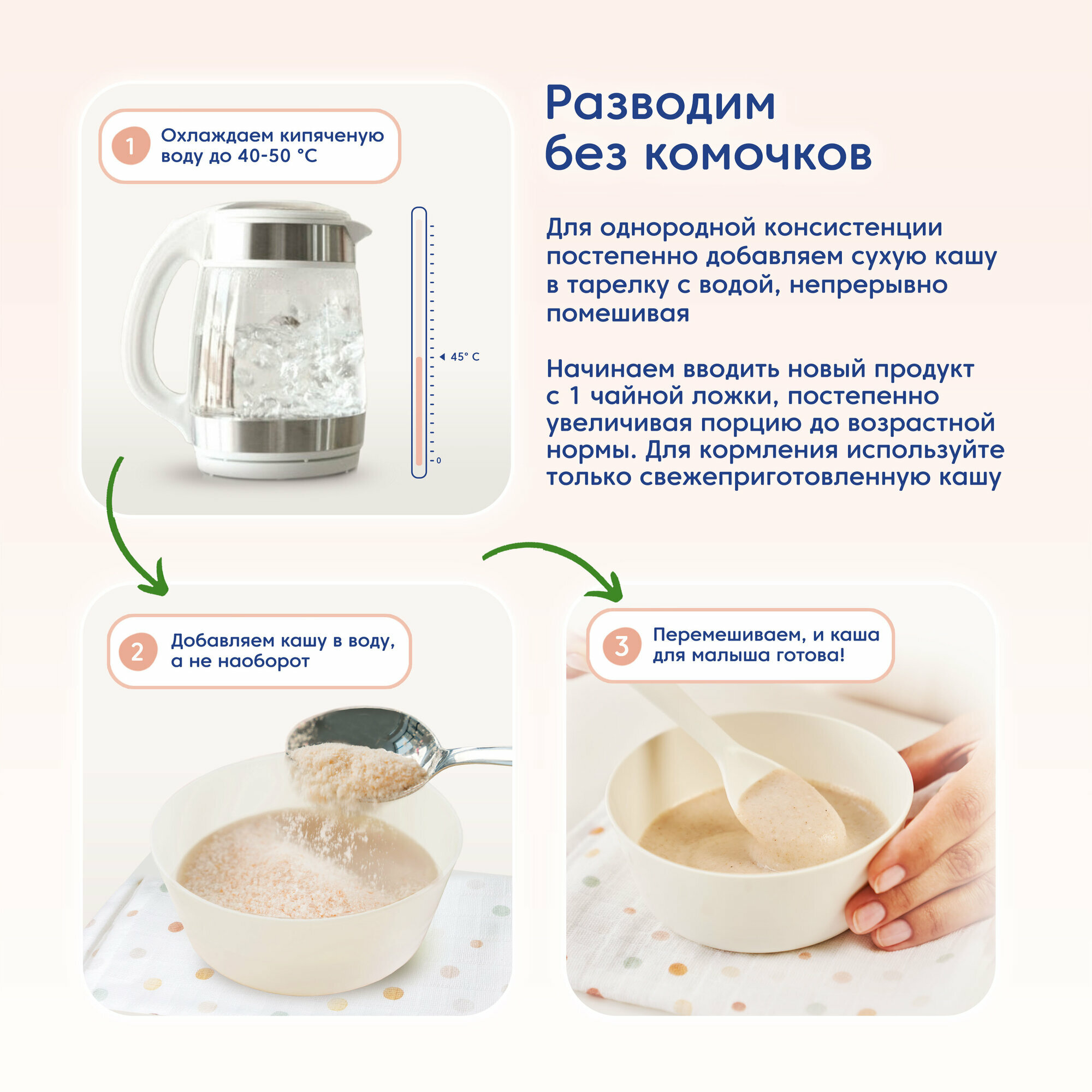 | Способ приготовления | Вымойте руки. Вскипятите 120 мл воды, охладите до 40–50 °С, налейте в чистую посуду. В отдельную чистую посуду насыпьте 40 г (5 ст. ложек) сухой каши. Постепенно добавляйте сухую кашу в тарелку с водой, непрерывно перемешивая до получения однородной консистенции. Проверьте температуру каши перед кормлением (37 °С). Продукт не требует варки. |