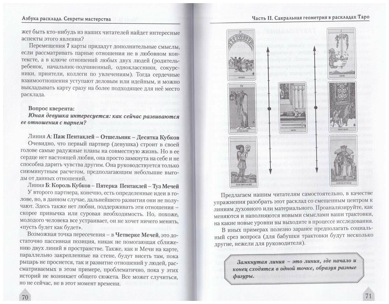Давно хотела купить данную книгу! Мои ожидания полностью оправдались. Сверхновой информации по раскладам искать не стоит, но вот углубите свои знания однозначно! Авторы (члены российского таро клуба) очень подробно преподносят логику и правила прочтения расклада таро. Учитывается и пространство расклада и суть запроса клиента, сакральная геометрия. Даже обычный триплет получает несколько вариаций прочтения. Есть простые и сложные примеры раскладов, подробнве и качественные иллюстрации. Получила истинное удовольствие от прочтения данного издания. Полиграфия отличная! Рекомендую!