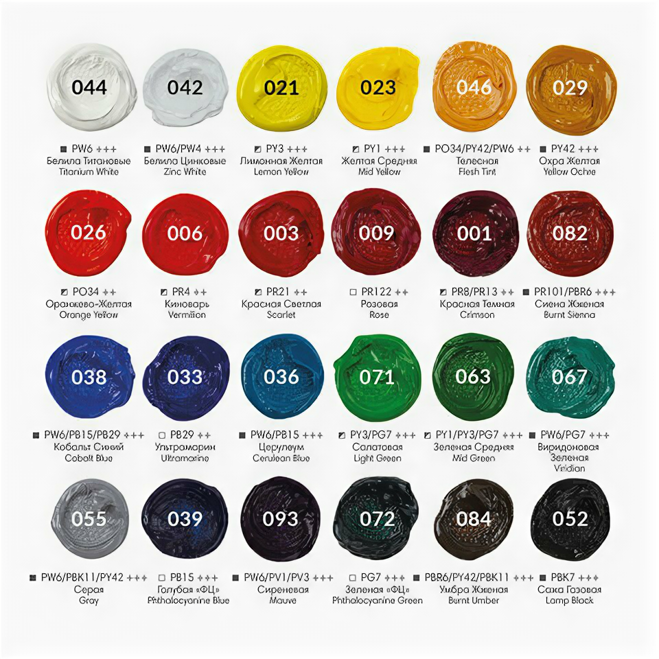 Краска имеет 5 степеней затирки пигмента. Вязкая текстура краски обеспечивает сохранение ее эластичности в течение длительного времени. Все краски легко смешиваются между собой. 12 цветов. Объем тубы - 22 мл.