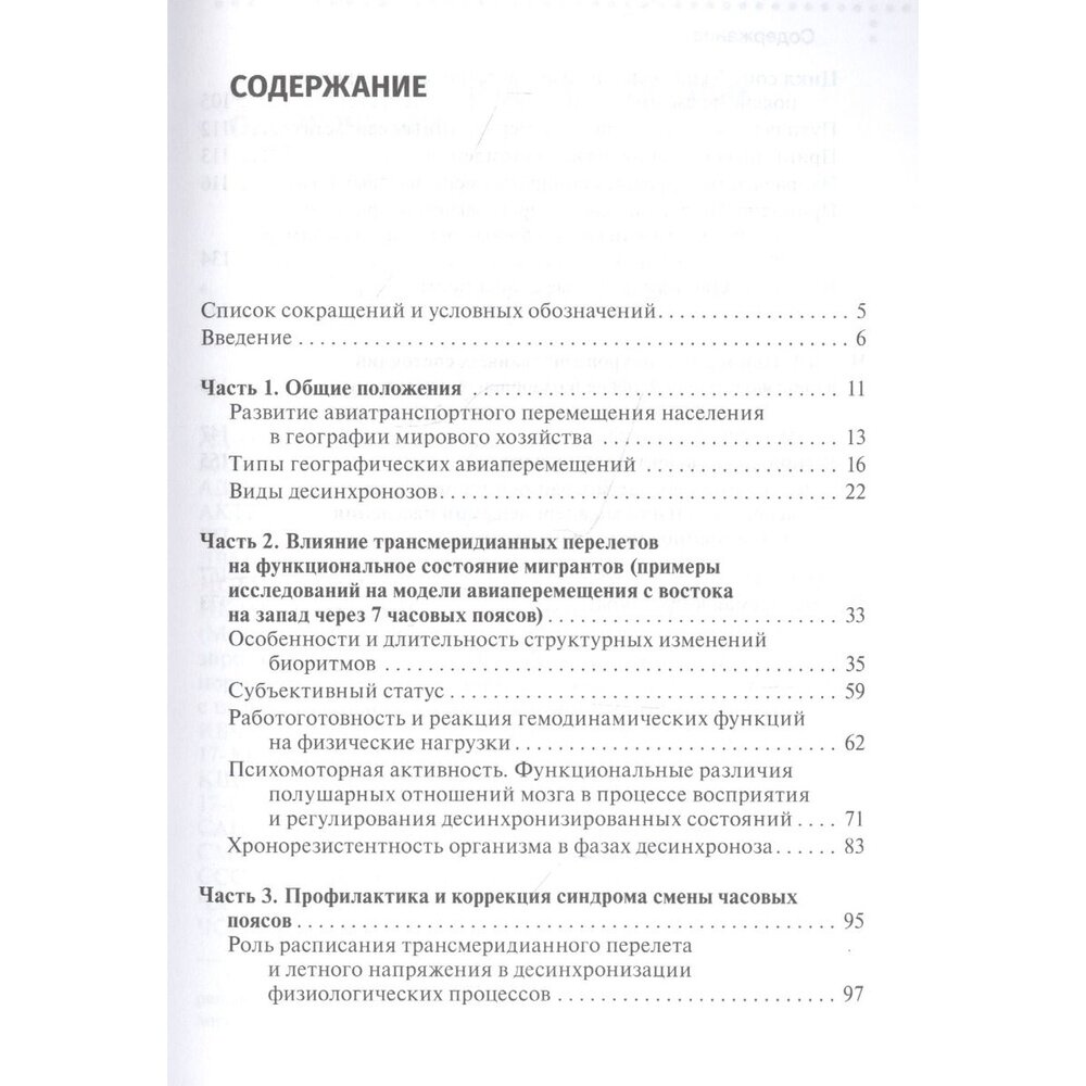 В руководстве рассмотрено влияние трансмеридианных авиаперемещений на функциональное состояние человека. Дана характеристика изменений биоритмов, субъективного состояния, работоготовности, гемодинамических реакций на физические напряжения, психомоторных показателей и межполушарной активности мозга, возникающих в контрастных геосоциовременны х регионах. Показан процесс резистентности и объективного статуса мигрантов в фазах десинхроноза. Обоснована методология диагностики и оценки прогнозной длительности хроноадаптации. Приведены примеры десинхронизированных состояний в производственной сфере, спорте, лечебно-оздоровительном туризме. Предложены рекомендации, профилактические и реабилитационные мероприятия по минимизации нежелательных эффектов синдрома смены часовых поясов.