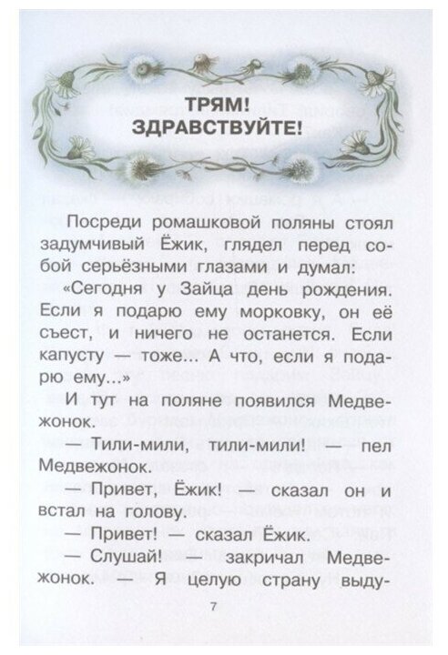 Писать о "Ежике в тумане" сказочника-волшебника Сергея Козлова с одной стороны - просто, а с другой - невероятно сложно. Ну как в нескольких строчках рассказать о необыкновенной, удивительно трогательной, закадычной дружбе Ежика, Медвежонка и Зайца, когда на День рождения от чистого сердца дарят целую волшебную страну "Тили-мили-трямдию" и целый букет ромашек, чтобы зимой у Зайца каждый день было свое солнышко на тоненькой ножке? Как можно было найти такие слова, чтобы читая эти сказки, и у малыша и тебя самого улыбка не сходила с лица, и ты, веришь что где-то, действительно, есть такая сказочная страна и в ней живут удивительные маленькие друзья с большим сердцем. Иллюстрации к сказкам очень трогательные, но в первую очередь на этих рисунках обращаешь внимание на глаза персонажей - такие добрые и немного наивные, что ты веришь в их бескорыстную дружбу. 2-я сказка - про Львенка и Черепаху. Бумага плотная, буквы очень крупные, межстрочные интервалы - удобные для чтения. Рекомендую