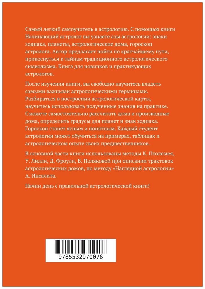 Самый легкий самоучитель в астрологию. С помощью книги Начинающий астролог вы узнаете азы астрологии: знаки зодиака, планеты, астрологические дома, гороскоп астролога. Автор предлагает пойти по кратчайшему пути, прикоснуться к тайнам традиционного астрологического символизма. Книга для новичков и практикующих астрологов. После изучения книги, вы свободно научитесь владеть самыми важными астрологическими терминами. Разбираться в построении астрологической карты, научитесь использовать полученные знания на практике. Сможете самостоятельно рассчитать дома и производные дома, определить градусы для планет и знак зодиака. Гороскоп станет ясным и понятным. Каждый студент астрологии может обучиться на примерах, таблицах и астрологическом опыте своих предшественников. В основной части книги использованы методы К. Птолемея, У. Лилли, Д. Фроули, В. Поляковой при описании трактовок астрологических домов, по методу «Наглядной астрологии» А. Инсалита. Начни день с правильной астрологической книги!