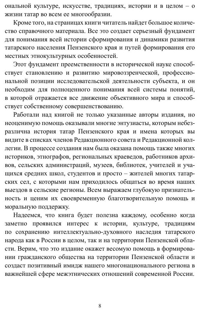 История татар-мишарей весьма интересна, богата и занимательна.На сегодняшний день значительной трудностью в изучении истории и татарского населения Пензенского края является достаточно ограниченное количество материала, которое имеется в региональных архивах, и которое остается все еще слабо изученным краеведами. Поэтому нет еще четко сформированного представления об этническом составляющем татар того периода времени. Перед Пензенскими краеведами Ф.М. ЗЮЗИНЫМ И Р.Х. АЛЮШЕВЫМ стояла задача найти материалы, изучить реальные факты и события, чтобы люди узнали об истории татар-мишарей, какой это народ, чем занимается, его достоинства и недостатки. Я думаю они с этим прекрасно справились. Первый том характеризует процесс этно-культурного развития и этногенеза татар-мишарей региона, языковые и этнокультурные особенности и традиции тюрко-татар, проживающих в Пензенской области и сопредельных территориях. Второй том труда посвящен истории татарских населенных пунктов Пензенского региона. При этом характеризуются все исторические (в том числе исчезнувшие) и современные, достаточно успешно развивающиеся села региона.Книга будет полезна каждому, кто проявит интерес к истории, культуре, традициям татарского народа как в России в целом, так и на территории Пензенской области. Надеюсь она будет интересна и подрастающему поколению. Ждем дальнейших трудов от наши краеведов.