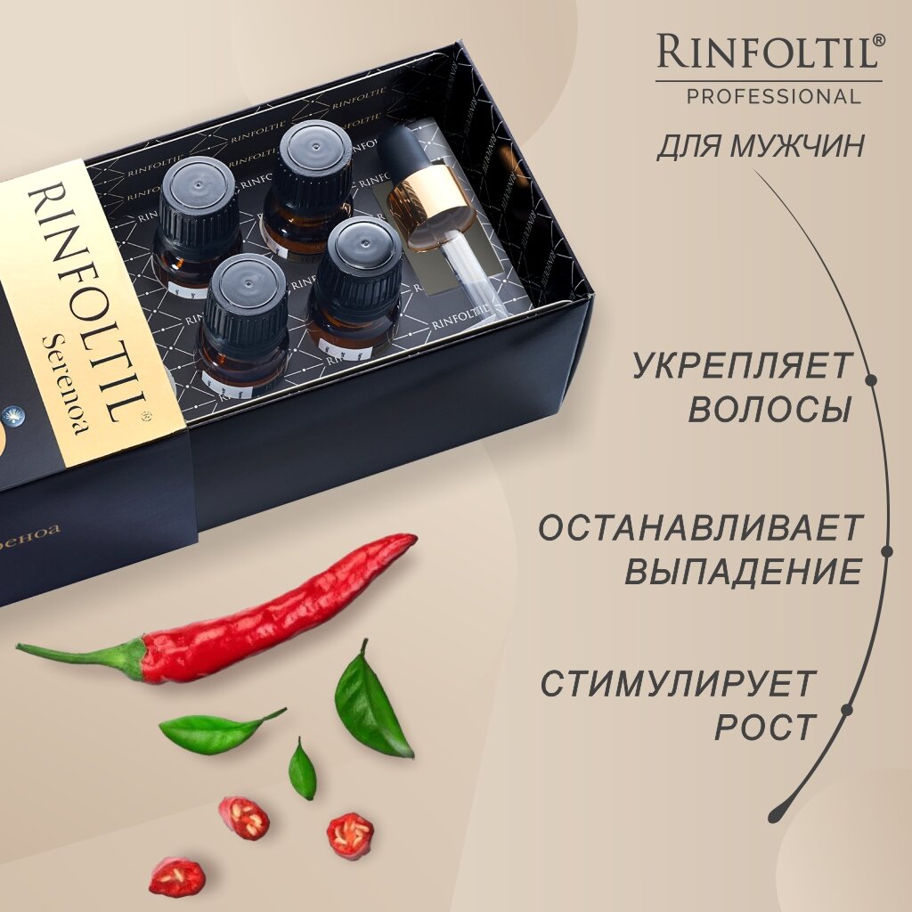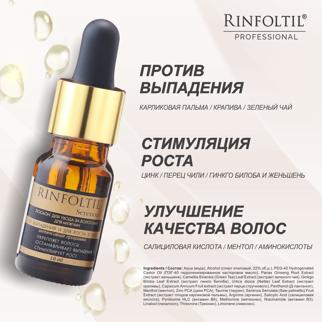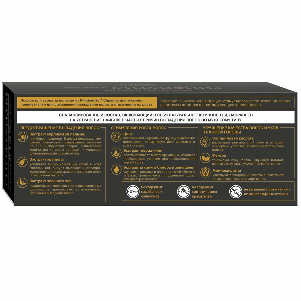 Сбалансированный состав, включающий в себя натуральные компоненты, направлен на устранение наиболее частых причин выпадения волос по мужскому типу:Восстановление количества волос Экстракт пальмы сереноа содержит природные ингибиторы фермента 5-альфа-редуктазы. Блокада этого фермента препятствует превращению тестостерона в дигидротестостерон, избыточное количество которого приводит к угасанию функции волосяных фолликулов.Экстракт перца чили и витамин B3 активизируют кровообращение, восстанавливают микроциркуляцию, создавая необходимые условия для восстановления фолликулов.Экстракт гинго билоба содержит вещества гинкголид B и билобалид, которые способствуют росту волос за счет ускорения деления клеток волосяных фолликулов.Укрепление волосяных фолликулов Экстракт крапивы Композиция биологически активных веществ, содержащихся в крапиве, обладая противовоспалительным эффектом, способствует укреплению волосяных фолликулов.Экстракт зеленого чая за счет содержащихся в нём катехинов и эфирных масел, стимулирует корни волос, и продлевает фазу роста волос (фазу анагена). Полифенолы, эфирные масла и кофеин, содержащиеся в экстракте, особенно рекомендуются людям с чрезмерно жирными волосами и перхотью.Улучшение качества волос и уход за кожей головы Салициловая кислота размягчает роговой слой кожи и очищает эпидермис, что особенно важно для мужчин, у которых потовые и сальные железы, как правило, более развиты, чем у женщин.Ментол уменьшает излишнее потоотделение и наработку кожного сала.Таурин, L-аргинин, L-метионин, L-треонин – сбалансированный комплекс аминокислот, участвующий в построении кератина, восстанавливающий прочность растущих волосНе содержит парабенов, силиконов и синтетических красителей. Не вызывает привыкания и не имеет эффекта отмены.Интенсивная программа для ухода за волосами «Ринфолтил Сереноа для мужчин» создана специально для мужчин.