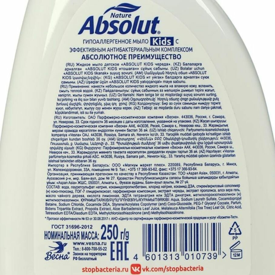 Сервис сравнения цен СкидкаГИД предлагает сравнить цены на товар «Мыло жидкое детское Absolut Kids с чередой гипоаллергенное 250мл»