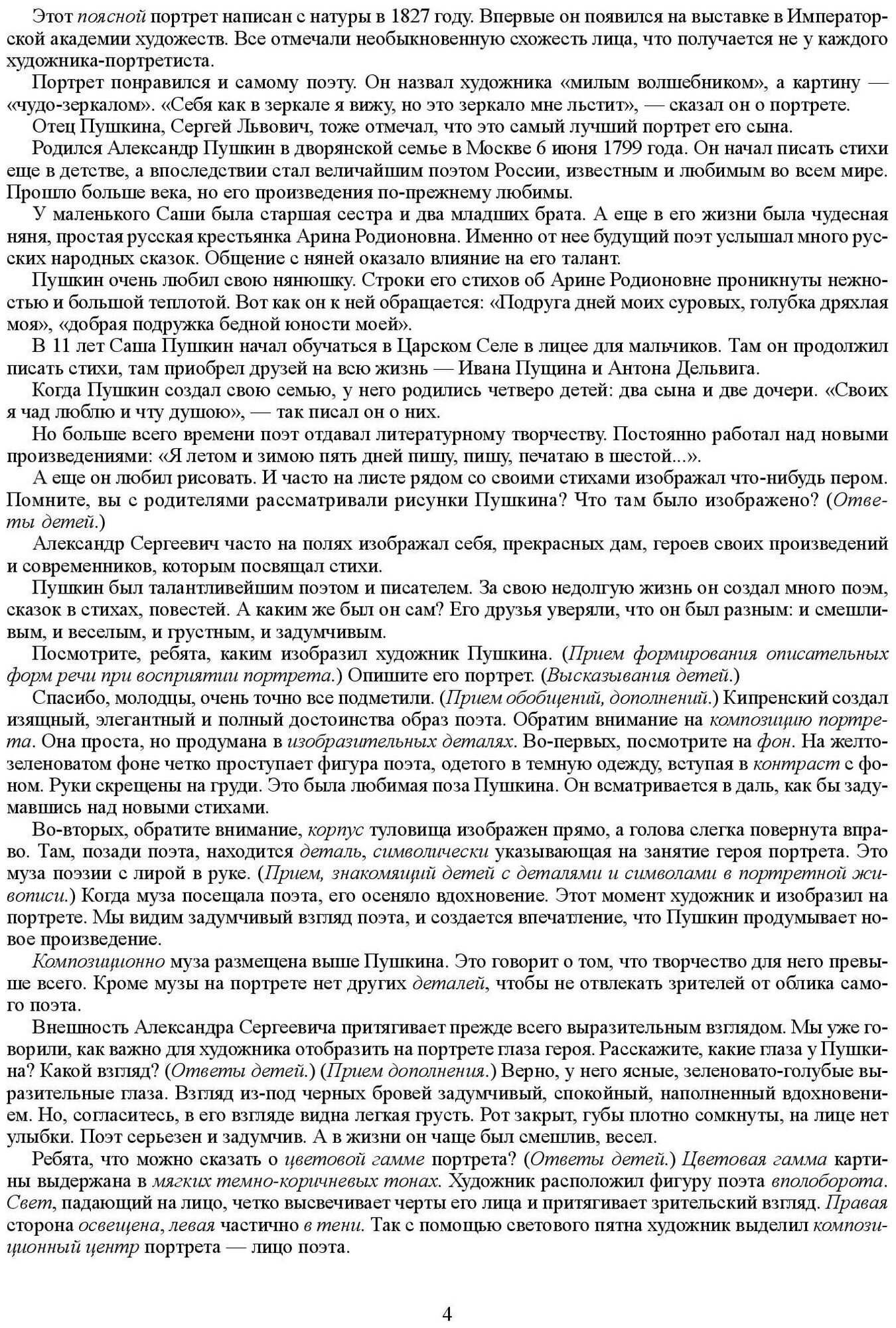 Пособие предназначено для знакомства старших дошкольников с произведениями живописи, запечатлевшими образ великого русского поэта А. С. Пушкина. Культурологическая составляющая предлагаемого цикла включает пять конспектов и репродукций картин разных видов: портреты поясной и в полный рост, жанровая картина, портрет-картина, двойной портрет. Издание не только знакомит детей с видами изобразительного искусства, но и формирует любовь к поэзии. Происходит первоначальное ознакомление с важными, доступными пониманию дошкольников этапами в жизни Пушкина и ролью няни Арины Родионовны в его становлении как поэта.