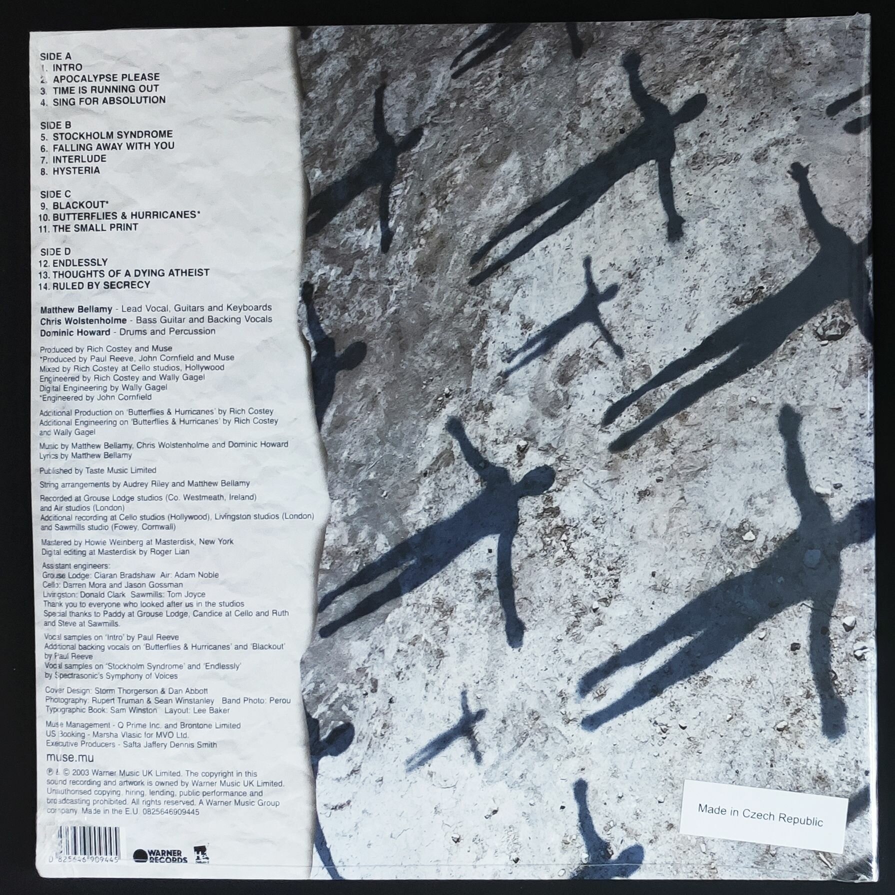 A1 Intro A2 Apocalypse Please A3 Time Is Running Out A4 Sing For Absolution B1 Stockholm Syndrome B2 Falling Away With You B3 Interlude B4 Hysteria C1 Blackout C2 Butterflies & Hurricanes C3 The Small Print D1 Endlessly D2 Thoughts Of A Dying Atheist D3 Ruled By Secrecy Участники записи альбома Arranged By [String Arrangements By] – Audrey RileyArranged By [String Arrangements By] – Matthew BellamyBass Guitar, Backing Vocals – Chris WolstenholmeBooking [US, For MVO Ltd.] – Marsha VlasicDesign [Cover Design] – Dan Abbott (2)Design [Cover Design] – Storm ThorgersonDrums, Percussion – Dominic HowardEdited By [Digital Editing] – Roger LianEngineer – Rich CosteyEngineer – Wally GagelEngineer [Assistant, Air] – Adam NobleEngineer [Assistant, Cello] – Darren MoraEngineer [Assistant, Cello] – Jason GossmanEngineer [Assistant, Grouse Lodge] – Ciaran BradshawEngineer [Assistant, Livingston] – Donald ClarkEngineer [Assistant, Sawmills] – Tom JoyceEngineer [Digital Engineering] – Wally GagelExecutive-Producer – Dennis Smith (3)Executive-Producer – Safta JafferyLayout – Lee Baker (6)Lead Vocals, Guitar [Guitars], Keyboards, Lyrics By – Matthew BellamyManagement – Brontone LimitedManagement – Q Prime Inc.Mastered By – Howie WeinbergMixed By – Rich CosteyMusic By – Chris WolstenholmeMusic By – Dominic HowardMusic By – Matthew BellamyPhotography By – Rupert TrumanPhotography By – Sean WinstanleyPhotography By [Band Photo] – PerouProducer – MuseProducer – Rich CosteyTypography [Typographic Book] – Sam Winston (2)