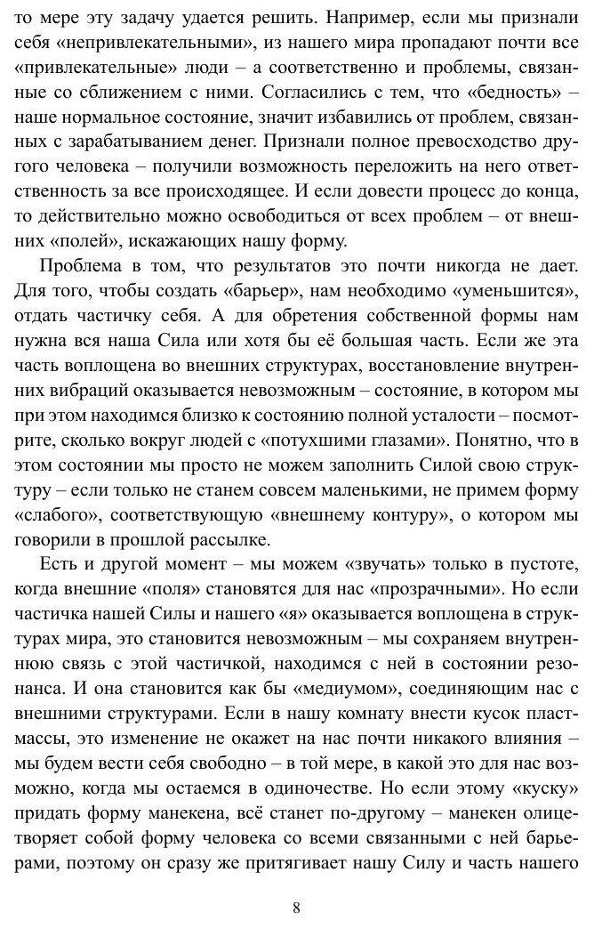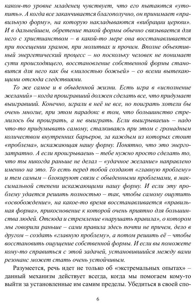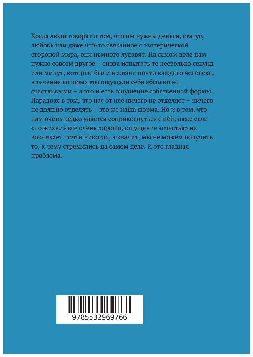 Когда люди говорят о том, что им нужны деньги, статус, любовь или даже что-то связанное с эзотерической стороной мира, они немного лукавят. На самом деле нам нужно совсем другое – снова испытать те несколько секунд или минут, которые были в жизни почти каждого человека, в течение которых мы ощущали себя абсолютно счастливыми – а это и есть ощущение собственной формы. Парадокс в том, что нас от неё ничего не отделяет – ничего не должно отделять – это же наша форма. Но и в том, что нам очень редко удается соприкоснуться с ней, даже если «по жизни» все очень хорошо, ощущение «счастья» не возникает почти никогда, а значит, мы не можем получить то, к чему стремились на самом деле. И это главная проблема.
