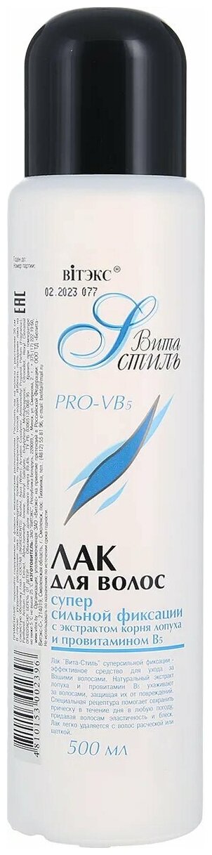 | Полное наименование | Лак для волос Витэкс С экстрактом корня лопуха и PRO-V-B5 500 мл |