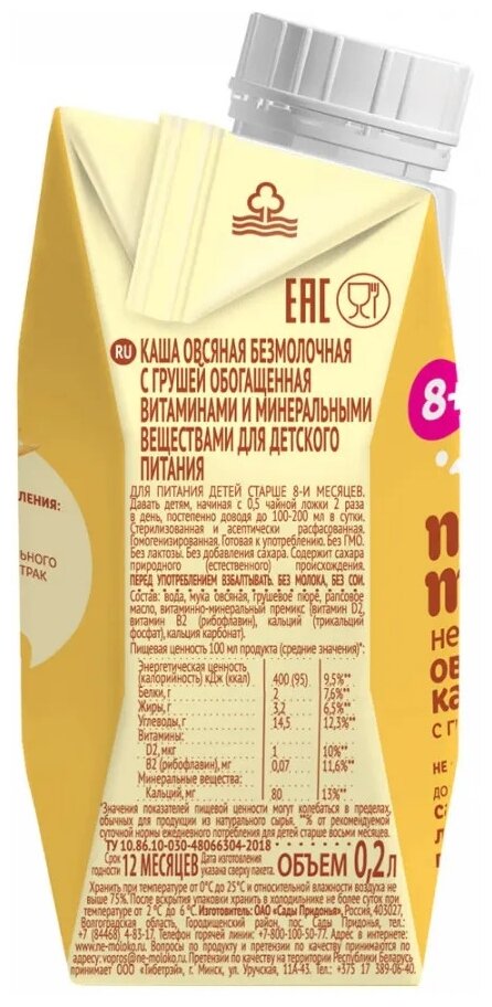 Состав: вода, овсяная мука, грушевое пюре, рапсовое масло, витаминно-минеральный премикс (витамин d2, витамин b2 (рибофлавин), трикальций фосфат, карбонат кальция)