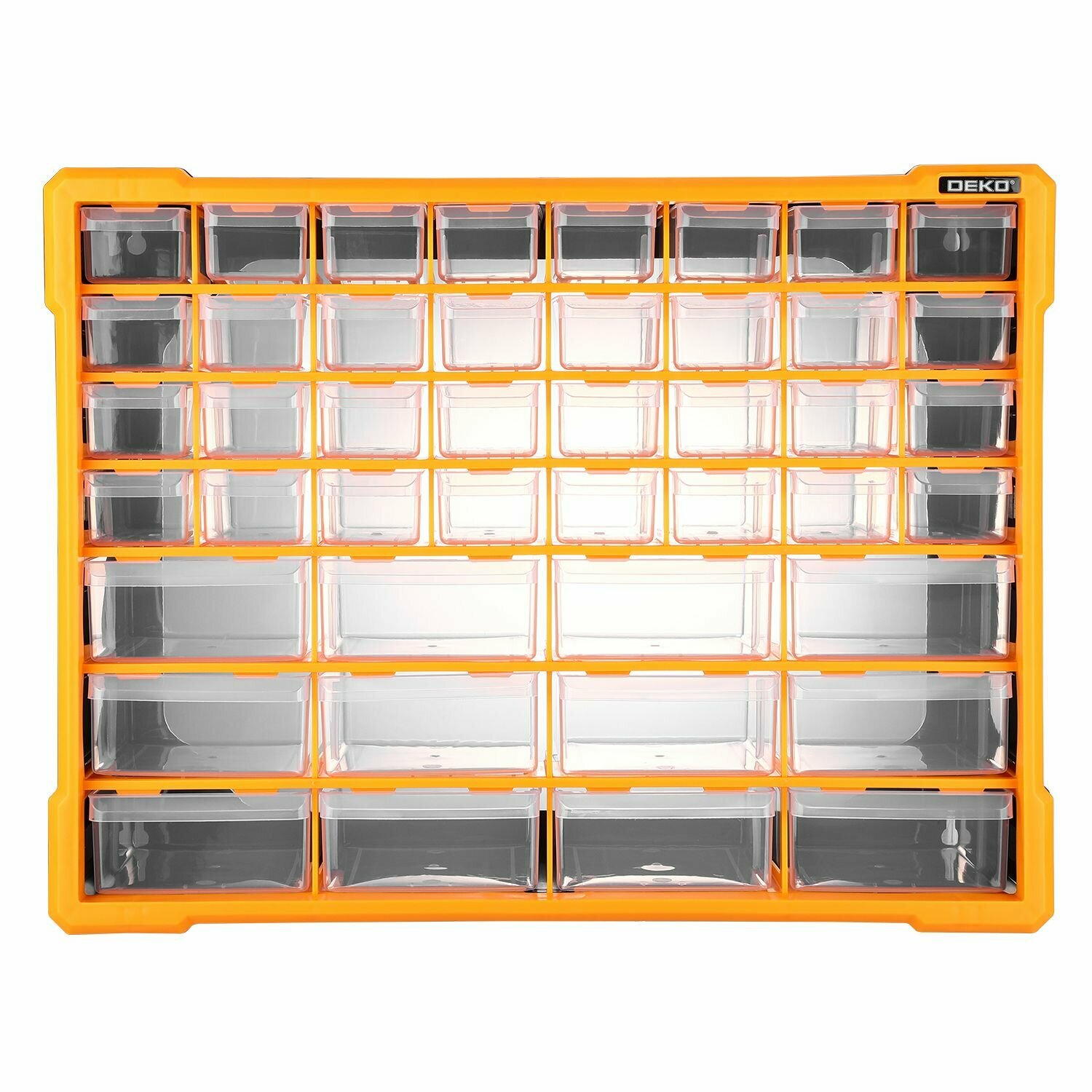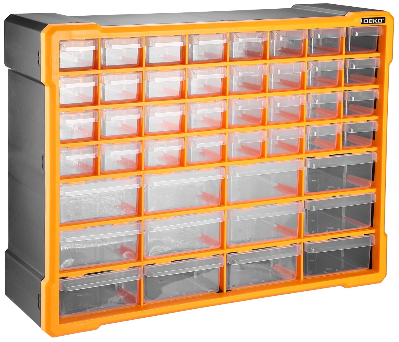 Система хранения DEKO , 44 выдвижных ящика включает в себя большое количество малых и средних секций. Вся конструкция подходит для небольшого ручного инструмента и оснастки. Ящики разделены на два типовых размера. Эта особенность конструкции позволяет отсортировать крепеж и оснастку согласно габаритам.