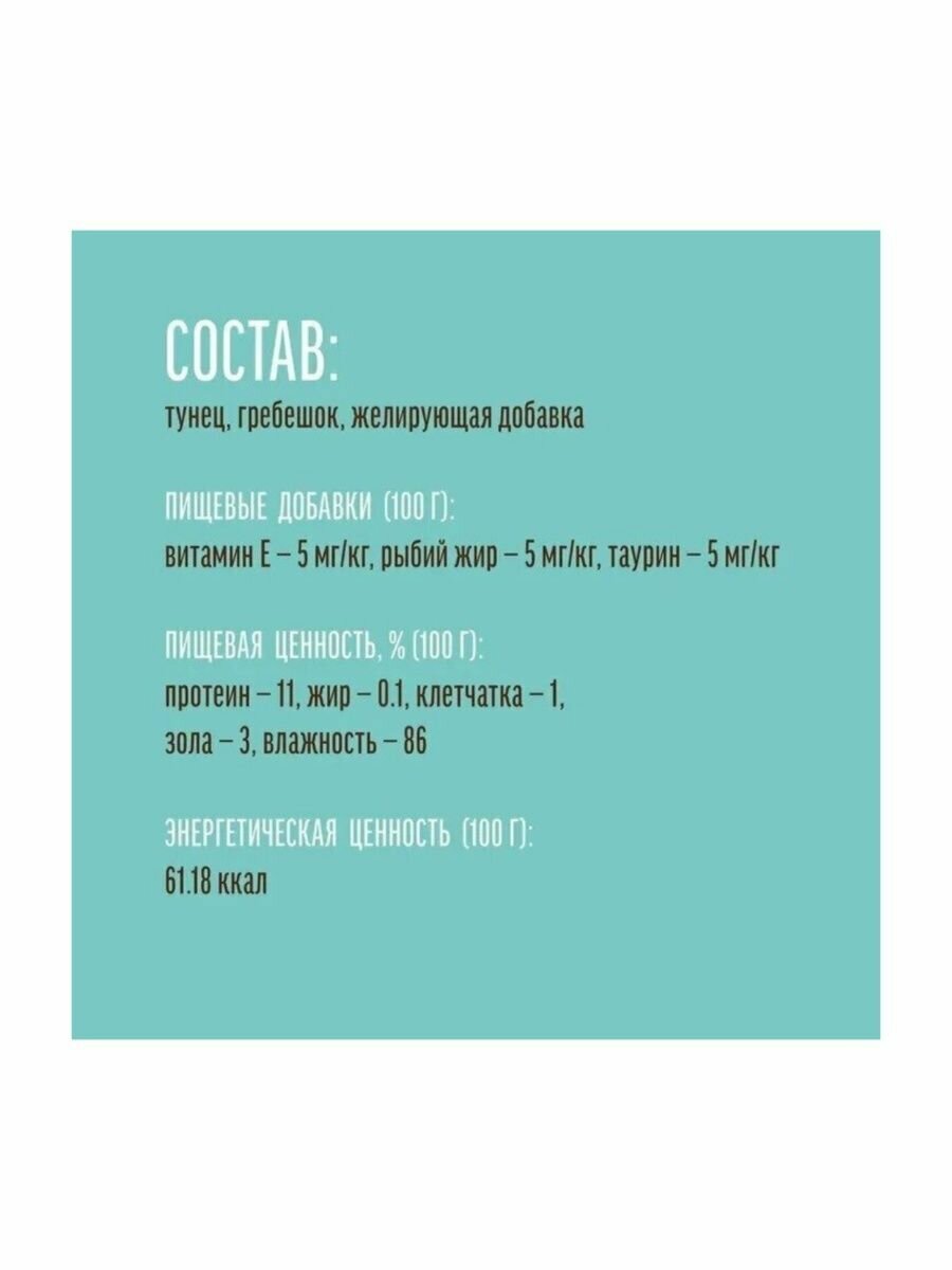 | Состав | Состав: тунец, гребешок, желирующая добавка, витамин E — 5 мг/кг, рыбий жир — 5 мг/кг, таурин — 5 мг/кг. Пищевая ценность на 100 г продукта, %: протеин — 11, жир — 0,1, клетчатка — 1, зола — 3, влажность — 86; энергетическая ценность — 61,18 ккал. |