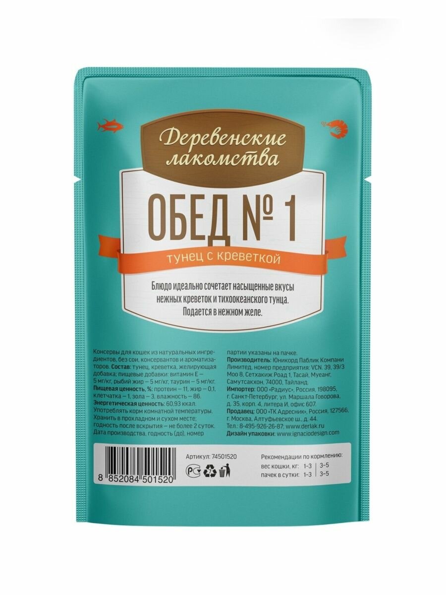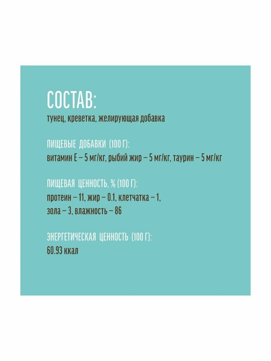 | Состав | Состав: тунец, креветка, желирующая добавка, витамин E — 5 мг/кг, рыбий жир — 5 мг/кг, таурин — 5 мг/кг. Пищевая ценность на 100 г продукта, %: протеин — 11, жир — 0,1, клетчатка — 1, зола — 3, влажность — 86; энергетическая ценность — 60,93 ккал. |