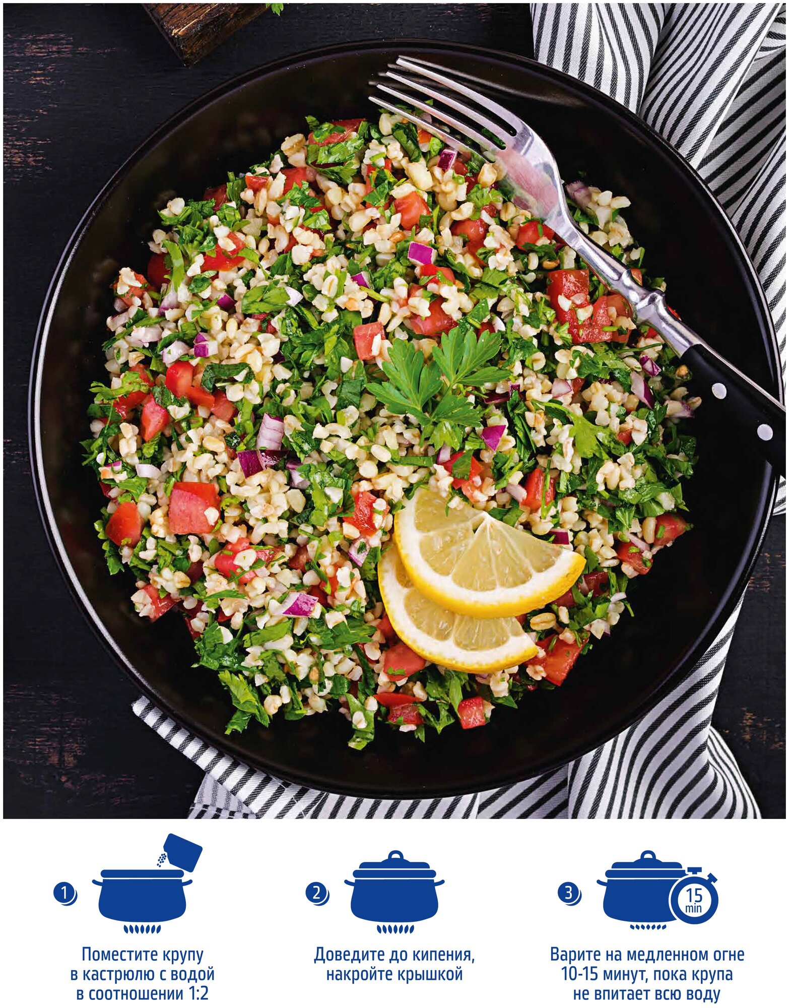 Булгур пропаренное и дробленое зерно твердых сортов пшеницы. Изобретенный свыше 4000 лет назад, он обрел большую популярность в Средиземноморье, Индии, странах Ближнего Востока и Азии. При приготовлении зерна сохраняют свою форму и остаются рассыпчатыми. Подходит для супов, салатов и гарниров, сочетается с курицей. Мясом и овощами.