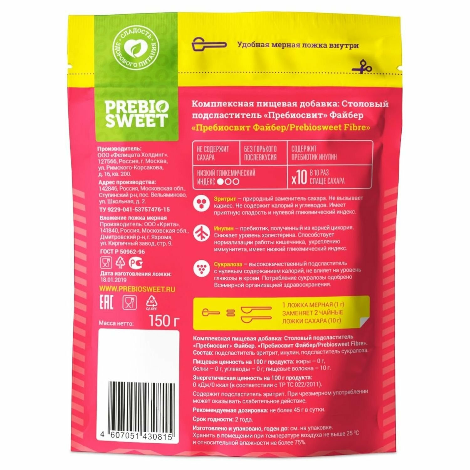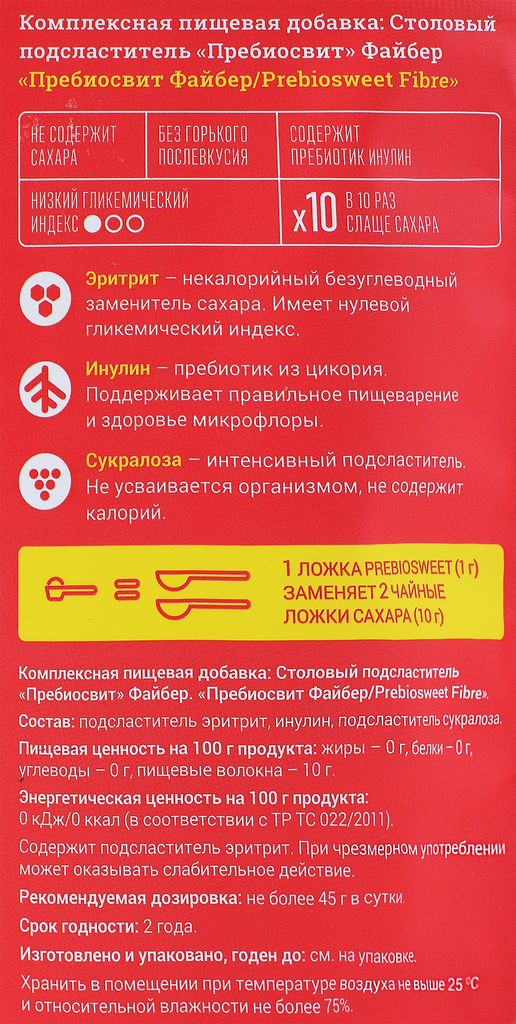 | Состав | Подсластитель эритрит, инулин, подсластитель сукралоза. |