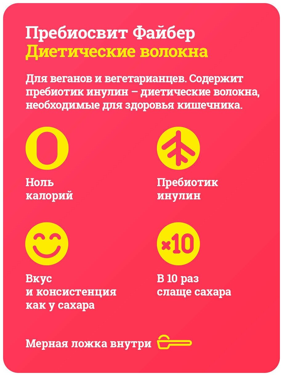 Функциональный подсластитель Пребиосвит Файбер и безопасен, и полезен. Входящий в его состав инулин (10%) нормализует работу кишечника. Инулин - это растительный пребиотик, который производится из корней цикория или топинамбура. Восполняет недостаток пищевых волокон в рационе; помогает поддерживать нормальный уровень сахара и холестерина в крови. Не калорийный. Незаменим при безуглеводной диете и косметическом голодании - способствует похудению и поддержанию здоровой формы. Удобно дозировать: мерная ложка прилагается в каждой пачке. 1 мерная ложка - 2 чайные ложки сахара. Чистый сладкий вкус. Не стимулирует выработку инсулина. Экономно: упаковка 300 г заменяет до 3 кг сахара. Подходит для людей, страдающих диабетом.