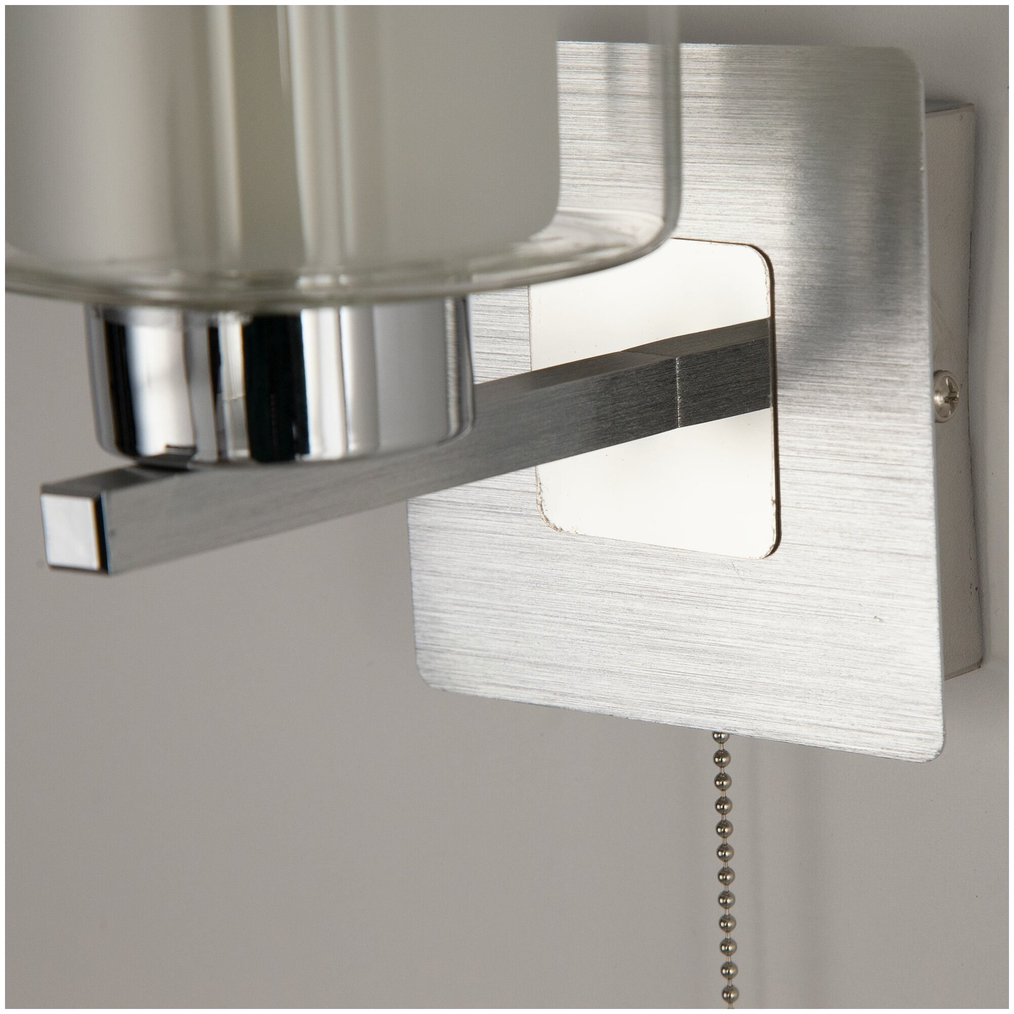 Бра Риволи в стиле модерн будет эффектно смотреться в современном интерьере спальни, гостиной или прихожей. Модель накладного типа, имеет металлическое квадратное основание с хромированным кронштейном, на который крепится двойной стеклянный плафон цилиндрической формы. Внутренняя часть плафона выполнена из бежевого матового стекла, мягко рассеивающего свет, а внешняя — из прозрачного. Для управления освещением используется удобный выключатель в виде цепочки.