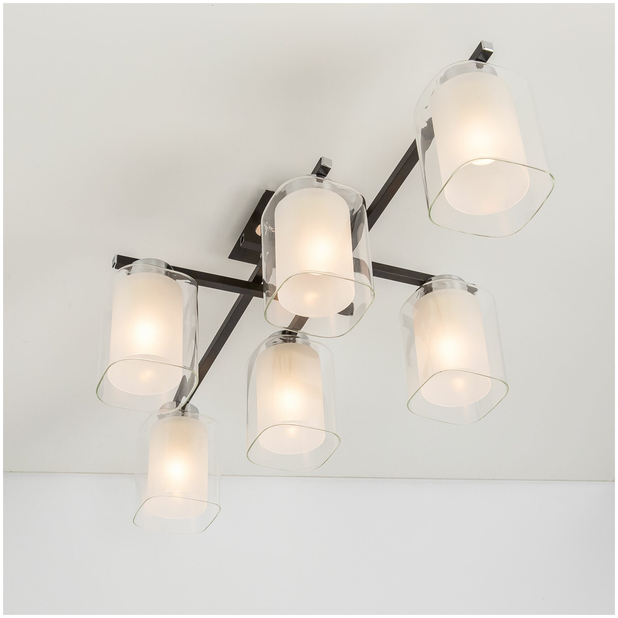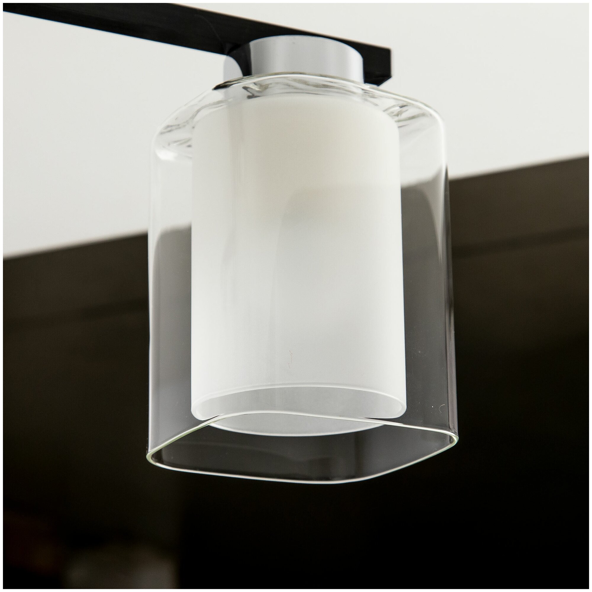 Люстра – минималистичный осветительный прибор, который прекрасно дополнит интерьер комнаты в современном стиле. Интересную композицию представляют собой двойные плафоны: прозрачный внешний и полуматовый внутренний, придающие люстре изящество и сглаживающие четкие линии металлического каркаса. Светильник отличается небольшой высотой, поэтому подходит даже для помещений с низкими потолками. Крепление типа планка позволяет быстро и просто монтировать прибор как к обычному, так и к натяжному потолку.