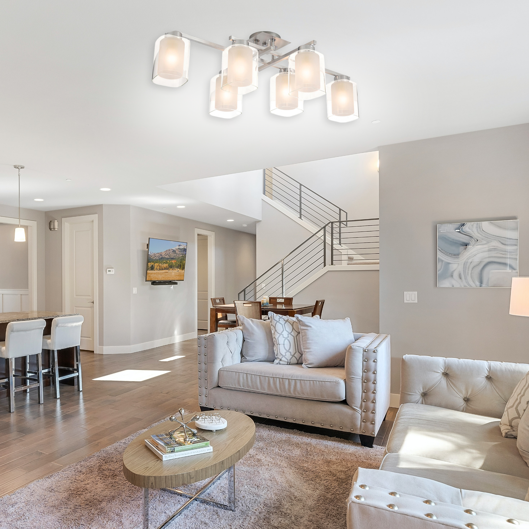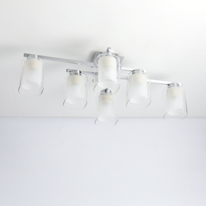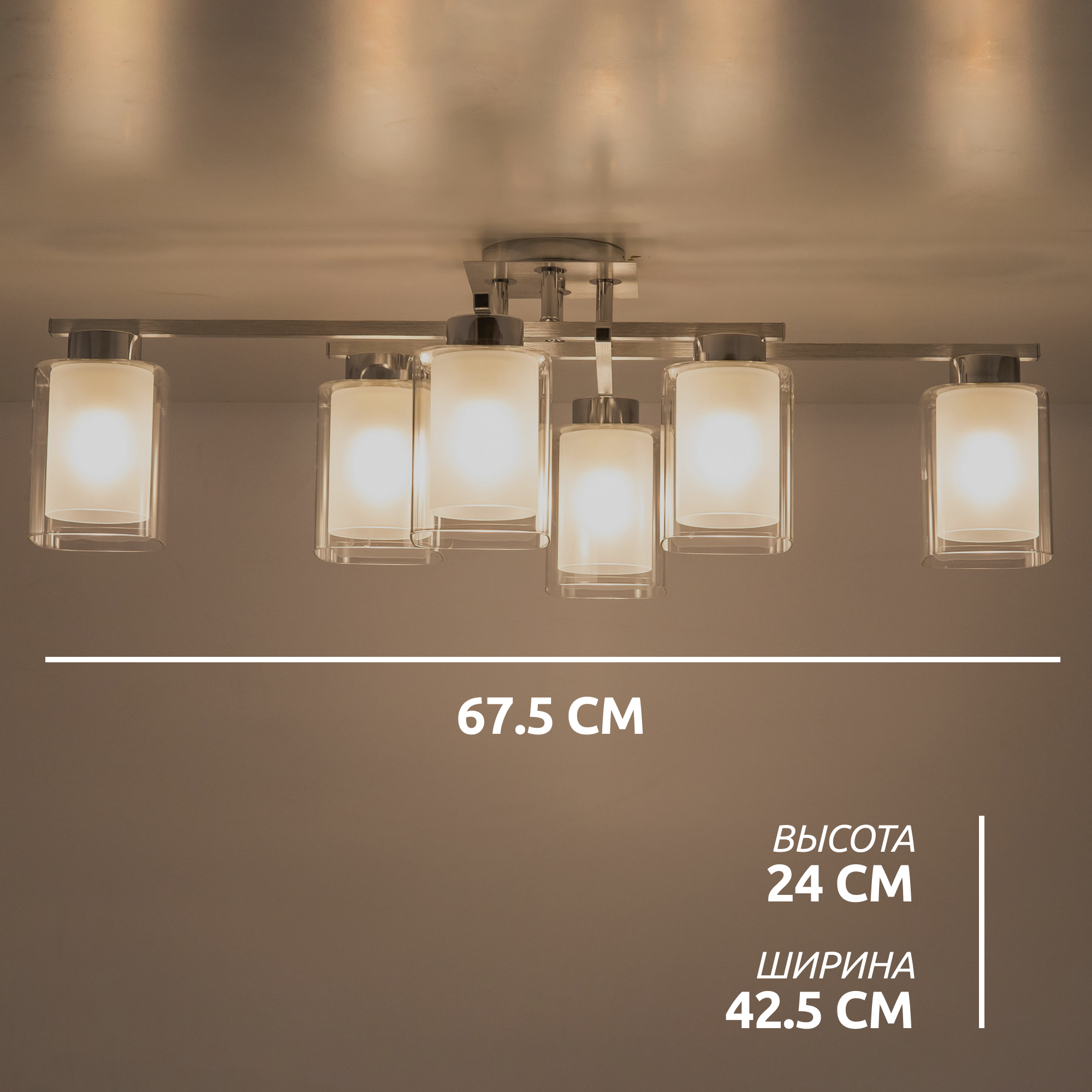 Люстра Диез – минималистичный осветительный прибор, который прекрасно дополнит интерьер комнаты в современном стиле. Интересную композицию представляют собой двойные плафоны: прозрачный внешний и полуматовый внутренний, придающие люстре изящество и сглаживающие четкие линии металлического каркаса. Светильник отличается небольшой высотой, поэтому подходит даже для помещений с низкими потолками. Крепление типа планка позволяет быстро и просто монтировать прибор как к обычному, так и к натяжному потолку.