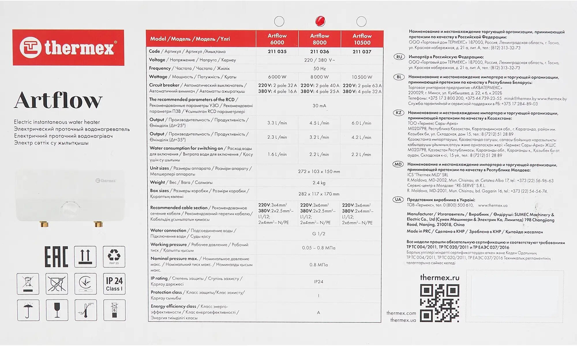 Серия Artflow - это проточные водонагреватели от одной из ведущих компаний в этой области, THERMEX. Водонагреватели имеют компактные размеры и приятный внешний вид. Ассортимент представлен 3-мя моделями мощностью 6, 8 и 10,5 кВт. Приборы серии отличаются высоким уровнем безопасности и надёжности, так как имеют необходимые функцияи защиты. Электрические водонагреватели спроектированы и изготовлены в строгом соответствии с национальными и международными стандартами, что обеспечивает надежную и безопасную эксплуатацию.