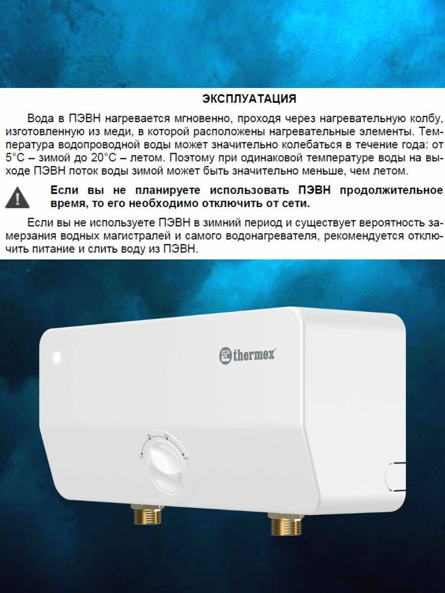 Проточный водонагреватель THERMEX (Термекс) предназначен для обеспечения горячей водой бытовых объектов, имеющих магистраль водоснабжения с необходимыми параметрами. Прибор должен использоваться в помещениях закрытого отапливаемого типа. Имеет спиралевидный нагревательный элемент и подает нагретую воду в несколько точек водоразбора.