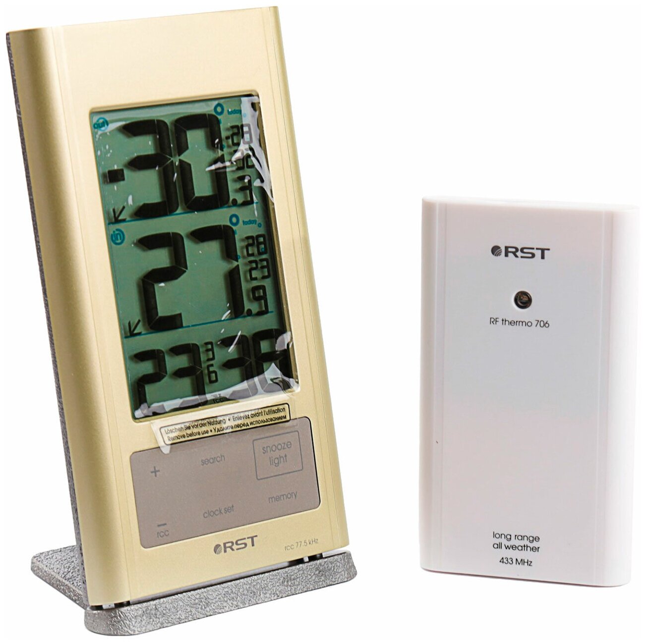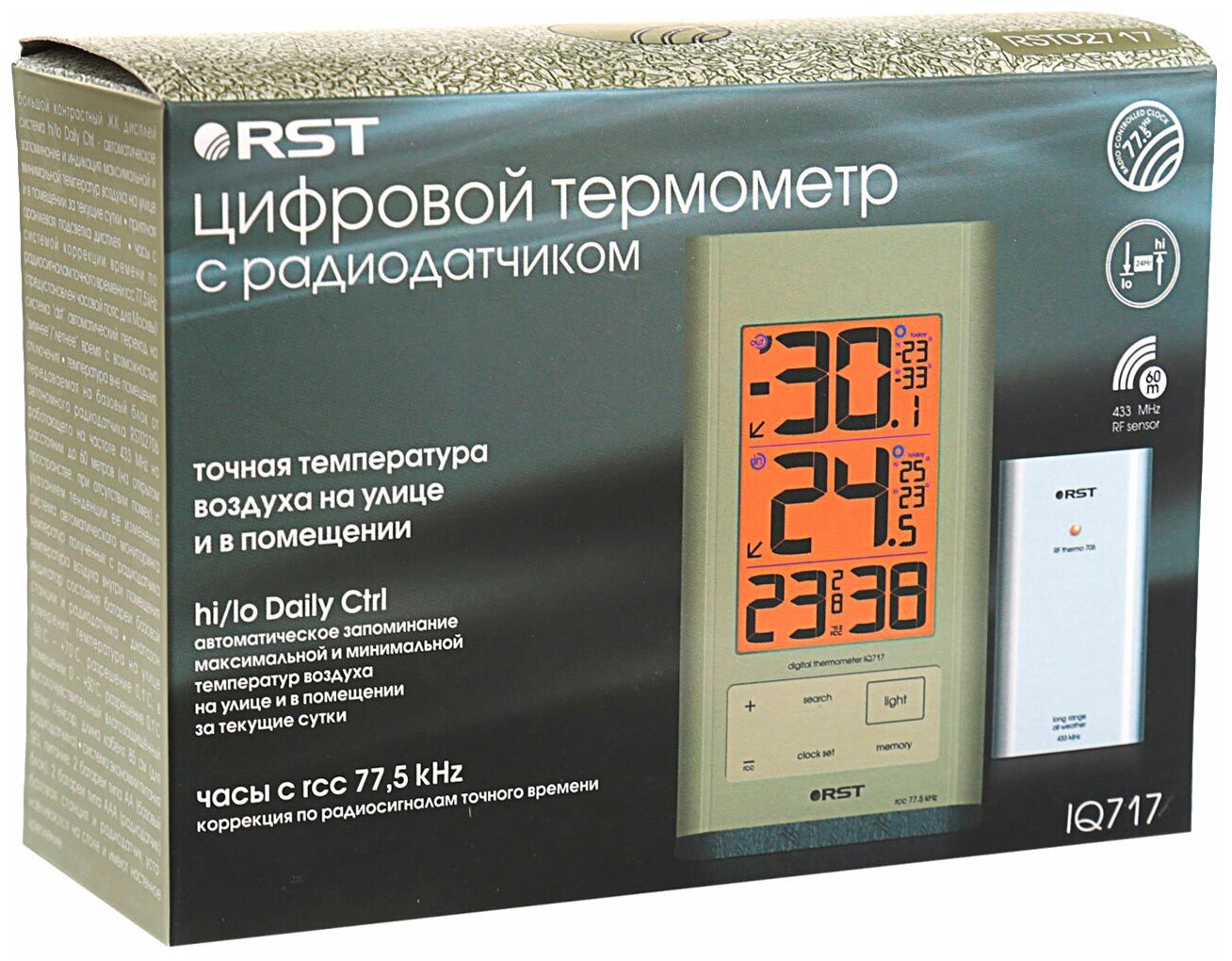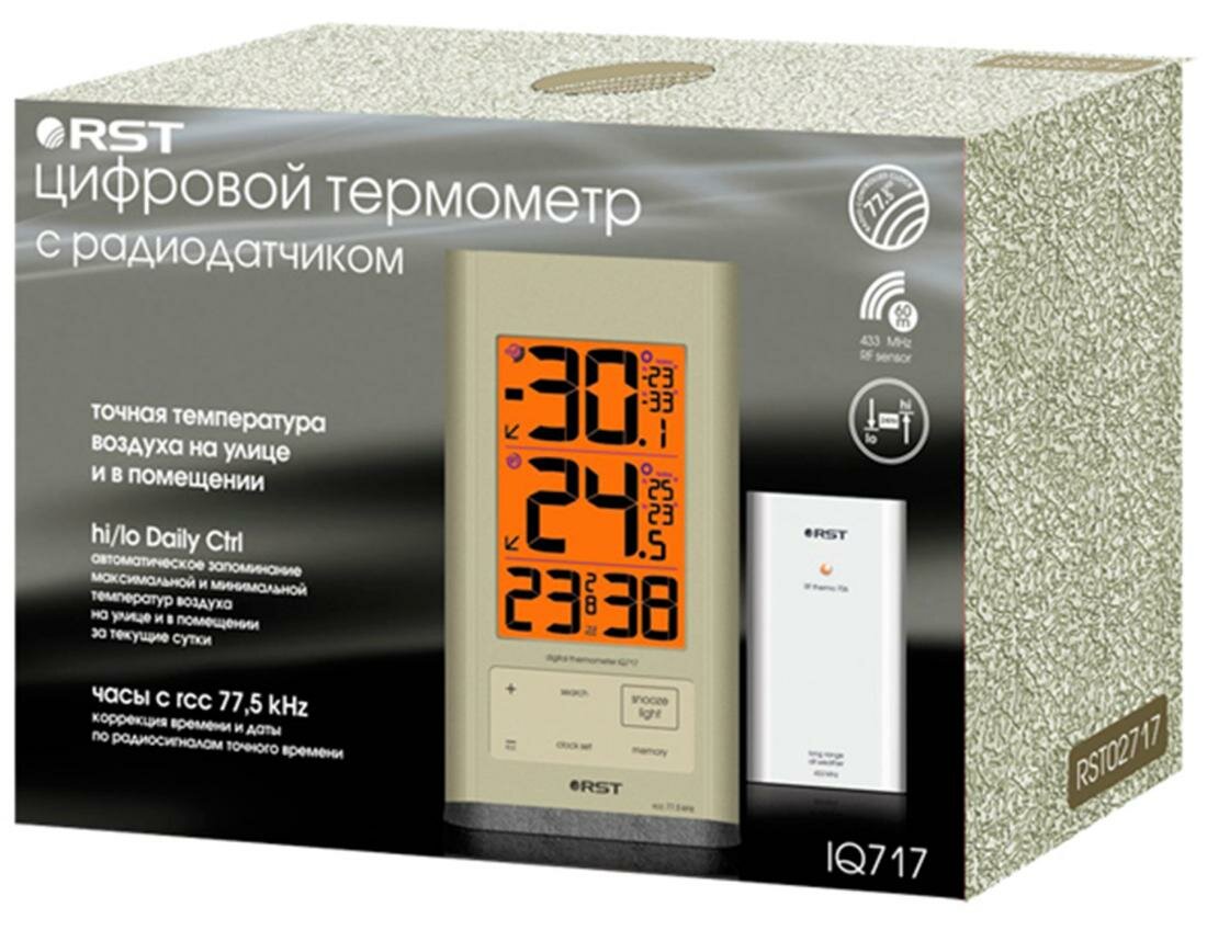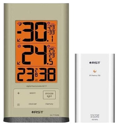 Цифровой бытовой термометр RST с радиодатчиком имеет подсветку дисплея. Используется для измерения температуры в помещении и на улице, определения тенденции и динамики изменения температуры, определения суточных максимального и минимального зарегистрированных значений температур. В электронный прибор встроены часы с rcc сигналом, календарь и будильник, сигнализатор возникновения гололеда, индикатор состояния батареи станции и бесконтактного радиодатчика.