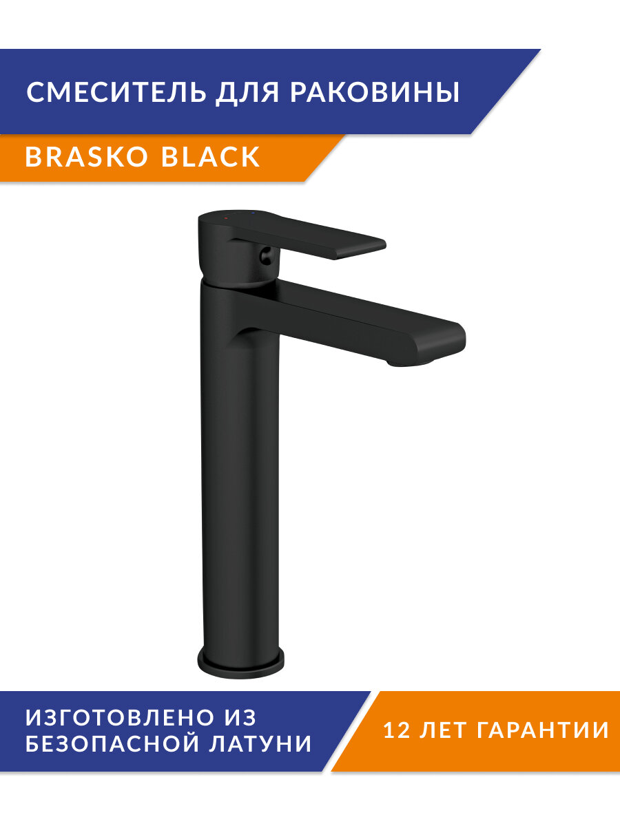 Смеситель для раковины высокий BRASKO BLACK однорычажный черный с донным клапаном клик клак
