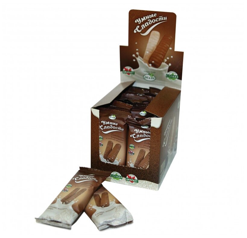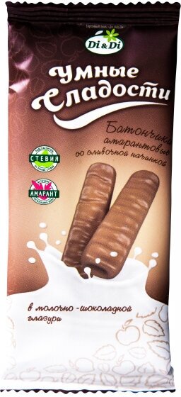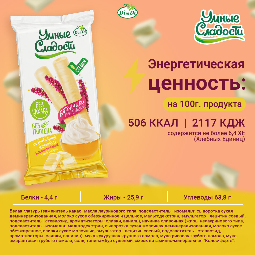 | Состав | глазурь молочно-шоколадная(заменитель какао-масла лауринового типа подсластитель изомальт, сыворотка сухая молочная, мальтодекстрин, какао-порошок, молоко сухое обезжиренное, молоко сухое цельное, эмульгатор лецитин соевый, подсластитель стевиозид(стевиолгликозиды, ароматизатор шоколад молочный) начинка сливочная(жиры нелауринового типа(не содержат гидрогенизированных компонентов), подсластитель изомальт, мальтодекстрин, сыворотка сухая молочная деминирализованная, молоко сухое обезжиренное, сливки сухие молочные, эмульгатор лецитин соевый, подсластитель стевиозид(стевиолгликозиды), ароматизатор сливки, ванилин), мука рисовая грубого помола, мука кукурузная тонкого помола, мука амарантовая грубого помола, вода питьевая, топинамбур сушеный, соль, смесь витаминно-минеральная ""Колос-форте""(тиамина мононитрат, рибофлавин, пиридоксина гидрохлорид, никотинамид, фолиевая кислота, железо сернокислое, антиокислитель - аскорбиновая кислота, мальтодекстрин) |
