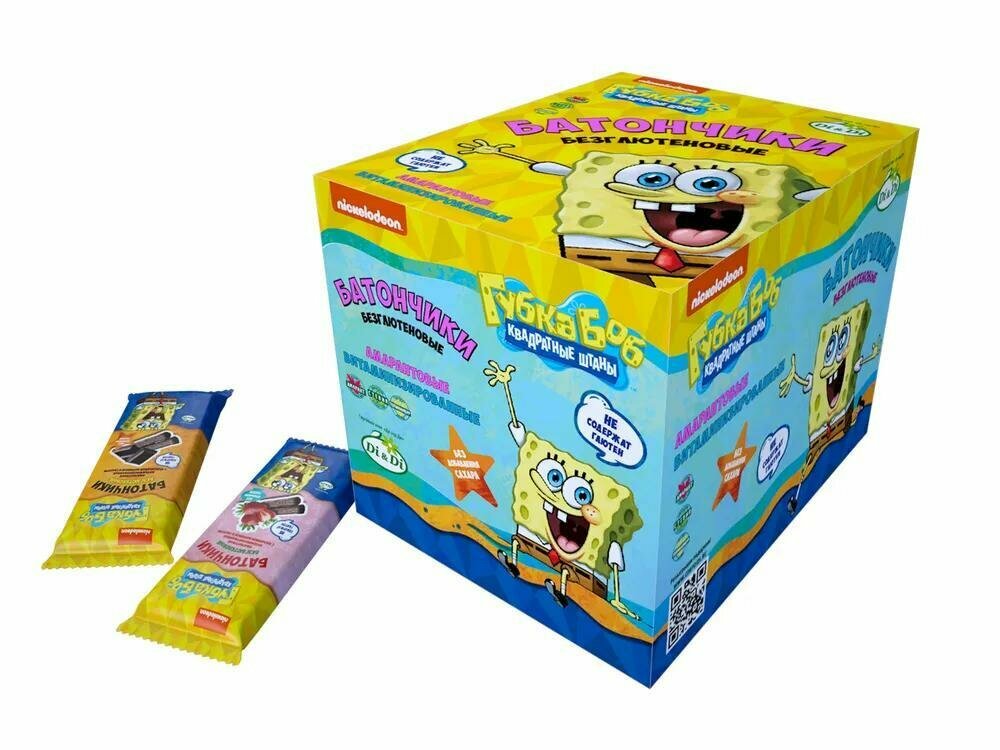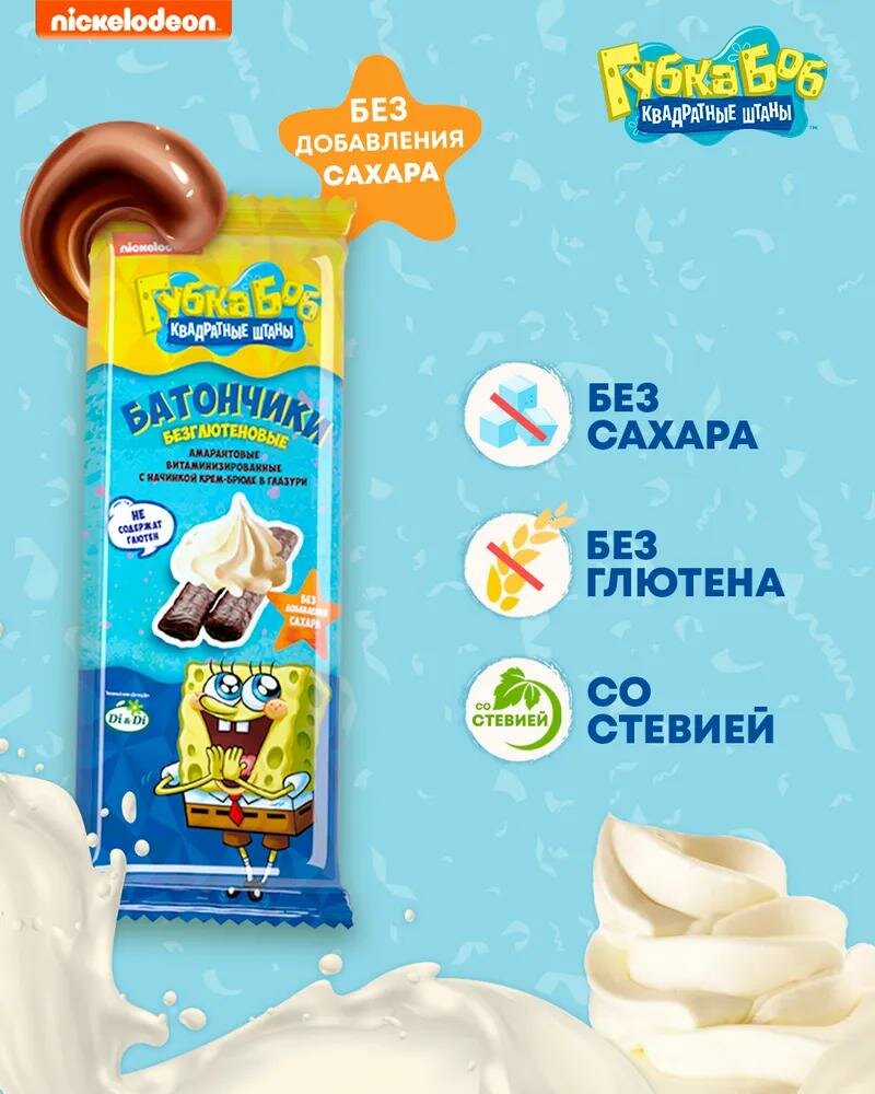 Батончики Губка Боб с начинкой крем-брюле не содержат сахара, глютена и дрожжей. Изготовлены из полезной смеси кукурузной, рисовой и амарантовой муки с добавлением топинамбура, насыщенной большим количеством клетчатки, растительного белка, витаминов и минералов.