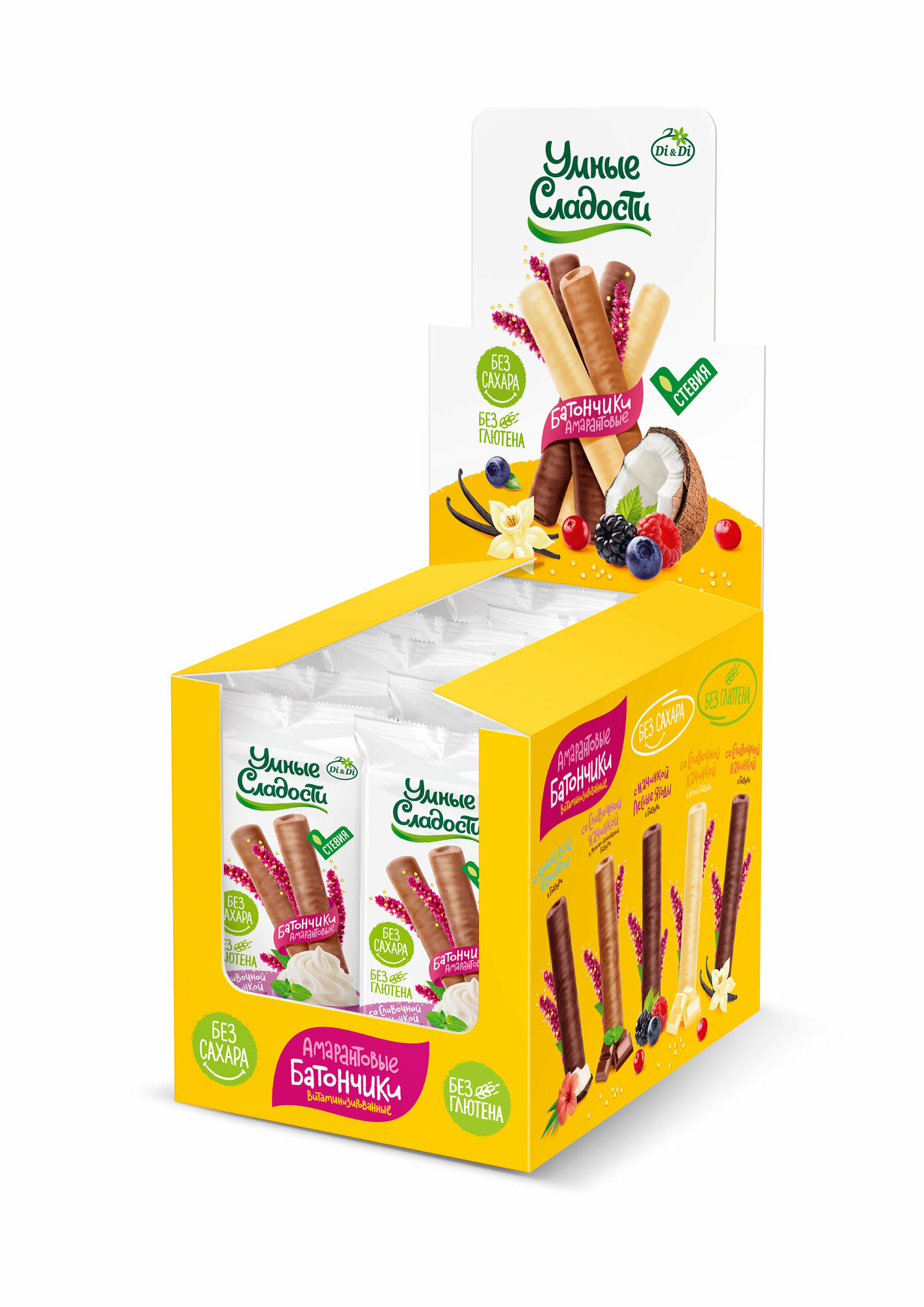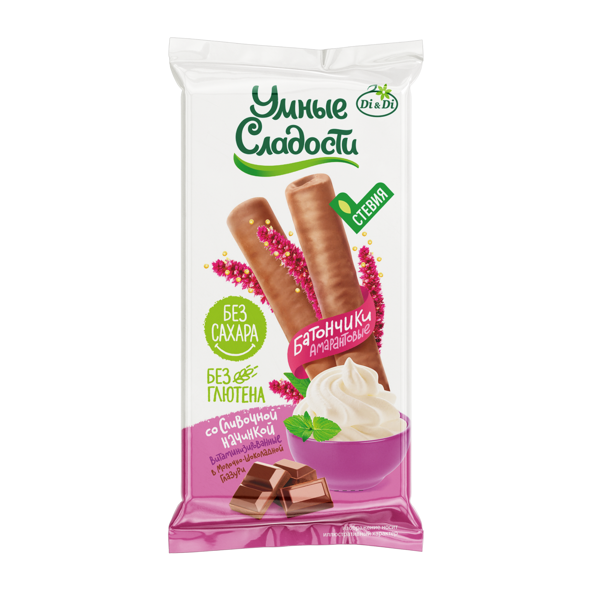 Безглютеновые батончики со сливочной начинкой в молочно-шоколадной глазури-не содержат сахара, глютена и дрожжей. Изготовлены из полезной амарантовой муки, насыщенной белком и большим количеством клетчатки. Кукурузная и рисовая мука входящие в состав, обладают высоким содержанием витаминов.