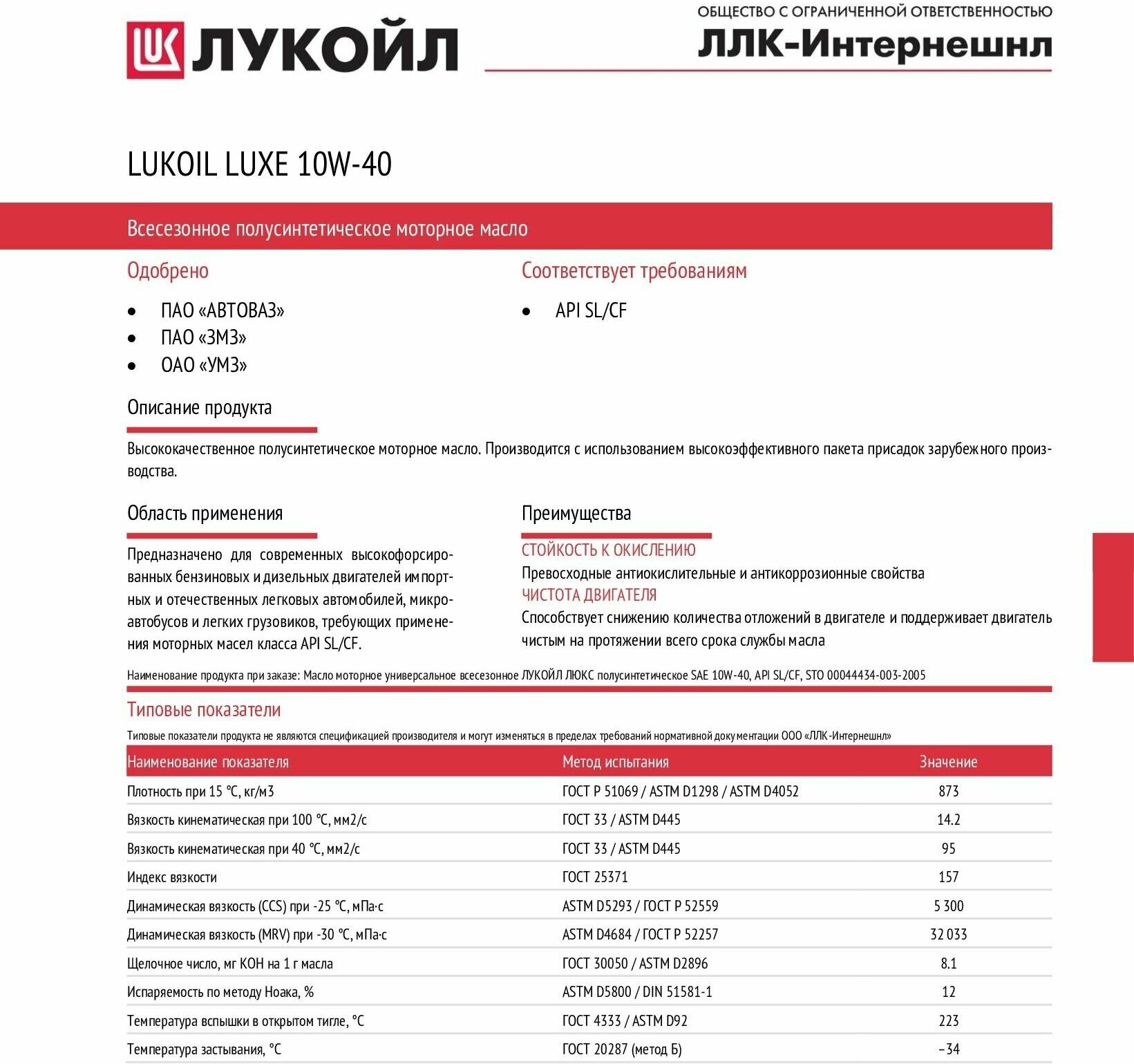Предназначено для современных высокофорсированных бензиновых и дизельных двигателей импортных и отечественных легковых автомобилей, микроавтобусов и легких грузовиков, требующих применения моторных масел класса API SL/CF.