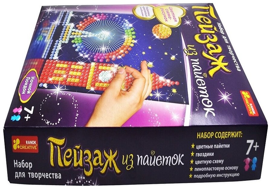 Комплектация:цветные пайетки , гвоздики , цветная схема , пенопластовая основа , инструкция.