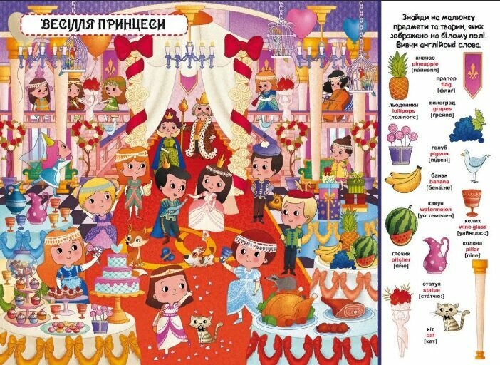 Предлагаем Вашему ребёнку отправиться в сказочное королевство, в гости к юным принцессам. Вместе с нашим виммельбухом он сможет посетить дворец, потанцевать на балу, побывать на пикнике и поучаствовать в рождественском маскараде. В книге-виммельбухе множество ярких и красочных картинок, рассматривая которые можно не только узнавать что-то новое, но и придумывать свои истории, выполнять интересные задания-игры, учить английские слова.