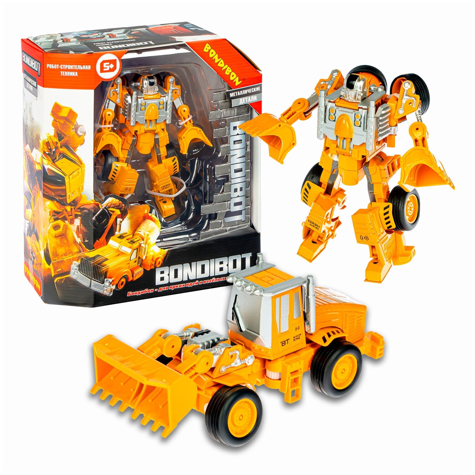 Чем порадовать маленького мальчика? Разумное решение робот – трансформер с металлическими деталями "BONDIBOT 2в1" - он покорил сердца всех мальчишек на планете! Проявив смекалку, ребенок сможет самостоятельно собирать и разбирать сколько угодно раз робота, превращая его в трактор с ковшом.В процессе игры ребенок развивает мелкую моторику, пространственное и образное мышление и тренирует воображение. Игрушка упакована в информативную коробку с демонстрационным окошком, размер коробки 9,5х24,5х21,5 см.