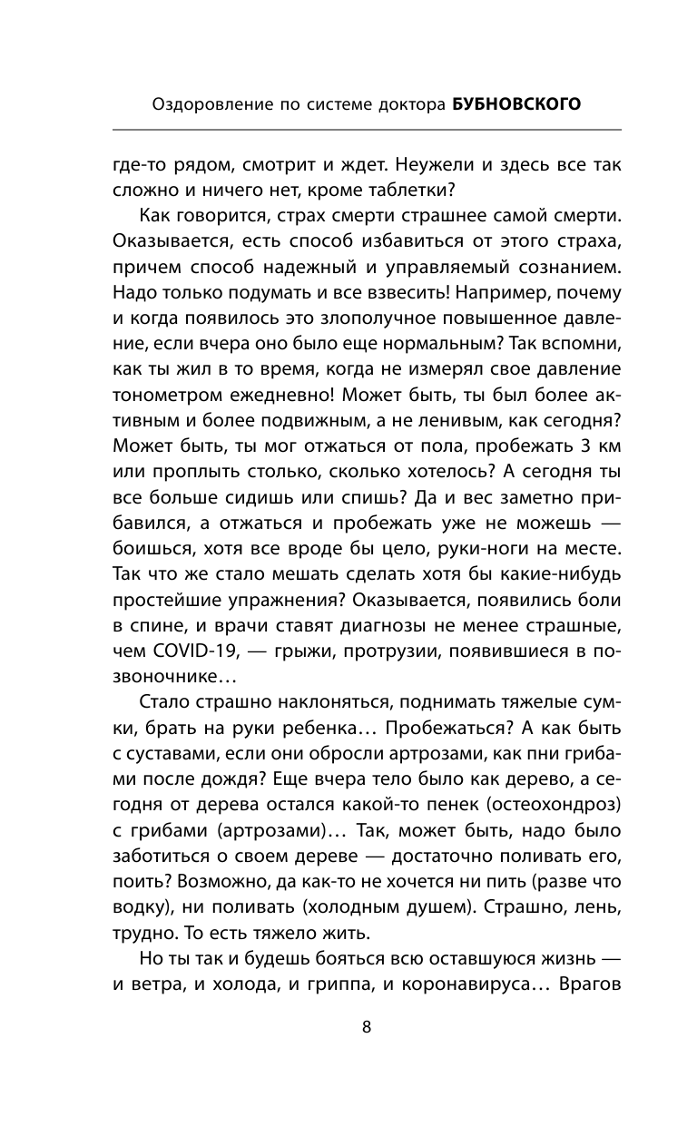 Книга сейчас актуальна как никогда. Она объясняет как переболевшему ковидом бороться с последствиями, которые после себя оставила болезнь. Я переболела минувшей зимой в легкой форме. Очень тяжело восстанавливалась. Одышка сохранялась несколько месяцев. Учитывая, что коронавирус может прилипнуть повторно, хочу укрепить иммунитет. Спасибо Бубновскому за полезные рекомендации. Жаль, что еще нет аудиоверсии.