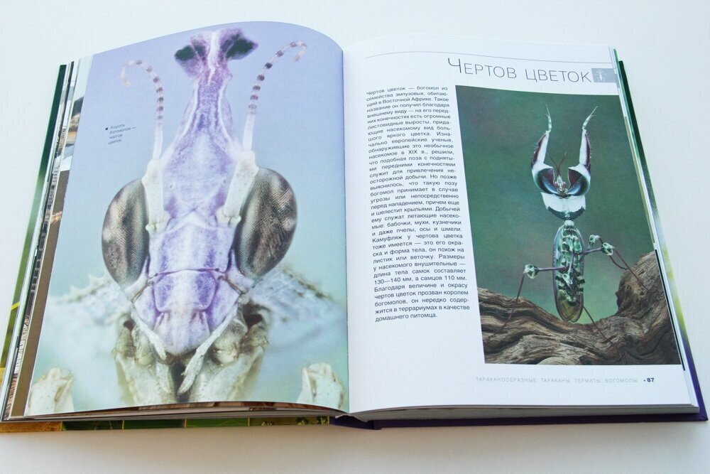 Толстая увесистая книжка с плотными страницами и твердым переплетом. Очень много фотографий в увеличении насекомых распространенных. Но, хотелось бы чтобы поменьше было например разновидностей стрекоз, а добавить того же комара. Его как то обошли стороной, а ведь он один из самых распространенных. Солдатиков и Сороконожек тоже нет. А так, все интересно, с удовольствием начали рассматривать и читать.