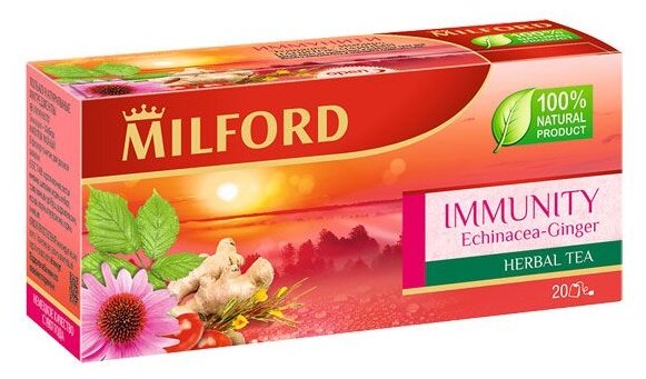 Вкусный и полезный травяной чай Милфорд с имбирём и эхинацеей, способствует укреплению иммунитета и имеет успокаивающий эффект. Польза травяного чая доказана и широко применяется в качестве элемента здорового питания. В плодах шиповника содержится большое количество витаминов, прежде всего, витамина С. Эхинацея укрепляет иммунитет, оказывает тонизирующее влияние, подавляет симптомы стресса. Сбор трав отличное средство для повышения защитных сил организма. Корень имбиря, в составе которого много аскорбиновой кислоты и незаменимых аминокислот, не только стимулирует защитные функции организма, но и сам обладает антивирусным, бактерицидным и противогрибковым свойствами благодаря содержанию в нём терпенов. Без кофеина, можно пить на ночь. Мы верим в синергетический эффект трав, сочетающих ингредиенты, повышающие их способность поддерживать хорошее самочувствие. Не является БАД.