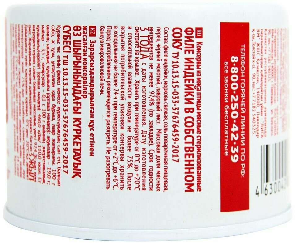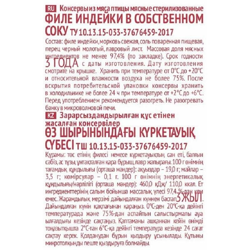 | Состав | Филе индейки, морковь свежая, соль поваренная пищевая, перец черный молотый, лавровый лист. |