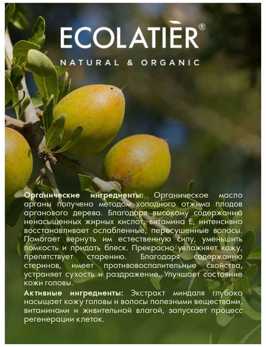 Описание Состав Применение Шампунь ECOLATIER на мягкой моющей основе бережно очищает волосы, не повреждает естественный защитный барьер кожи головы и волос. Соответствует требованиям Vegan Society (Великобритания). Органические ингредиенты: Органическое масло арганы получено методом холодного отжима плодов арганового дерева. Благодаря высокому содержанию ненасыщенных жирных кислот, витамина Е, интенсивно восстанавливает ослабленные, пересушенные волосы. Помогает вернуть им естественную силу, уменьшить ломкость и придать блеск. Прекрасно увлажняет кожу, препятствует старению. Благодаря содержанию стеринов, имеет противовоспалительные свойства, устраняет сухость и раздражение. Улучшает состояние кожи головы. Активные ингредиенты: Экстракт миндаля глубоко насыщает кожу головы и волосы полезными веществами, витаминами и живительной влагой, запускает процесс регенерации клеток.