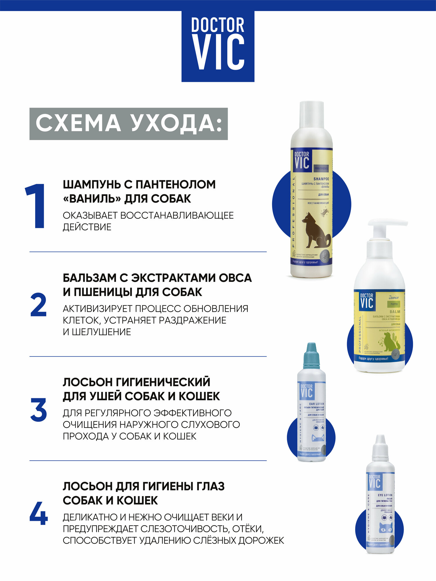 СЕРИЯ DOCTOR VIC PANTHENOL – это оптимальное решение для ежедневного ухода за шерстью вашего питомца. Активный компонент серии Д-пантенол уникален по своим увлажняющим, ранозаживляющим и противовоспалительным свойствам. Состав шампуня глубоко очищает, восстанавливает структуру кожно-волосяного покрова, защищает от неблагоприятных факторов окружающей среды, устраняет зуд, предохраняет кожу и шерсть животного от пересыхания.