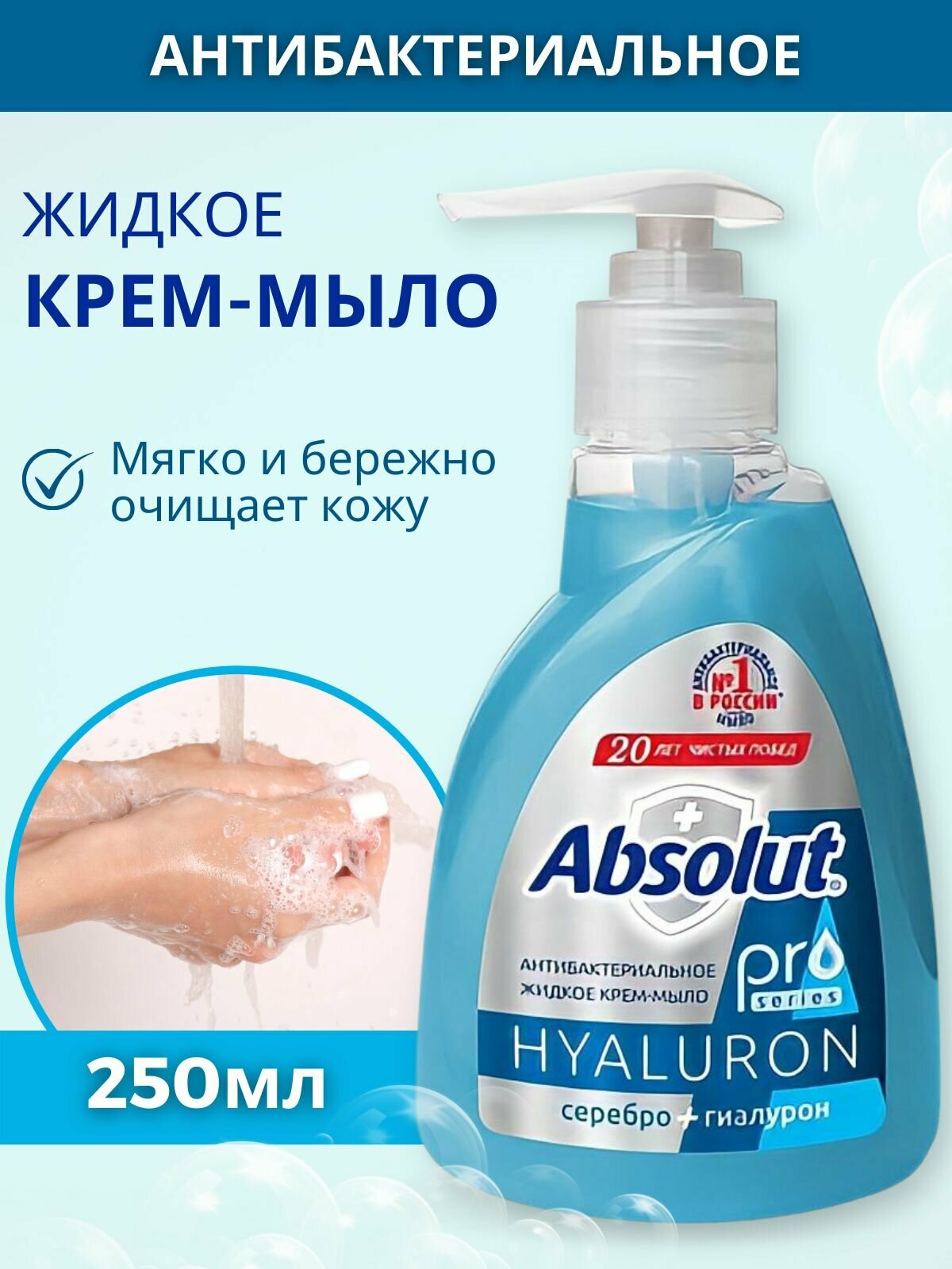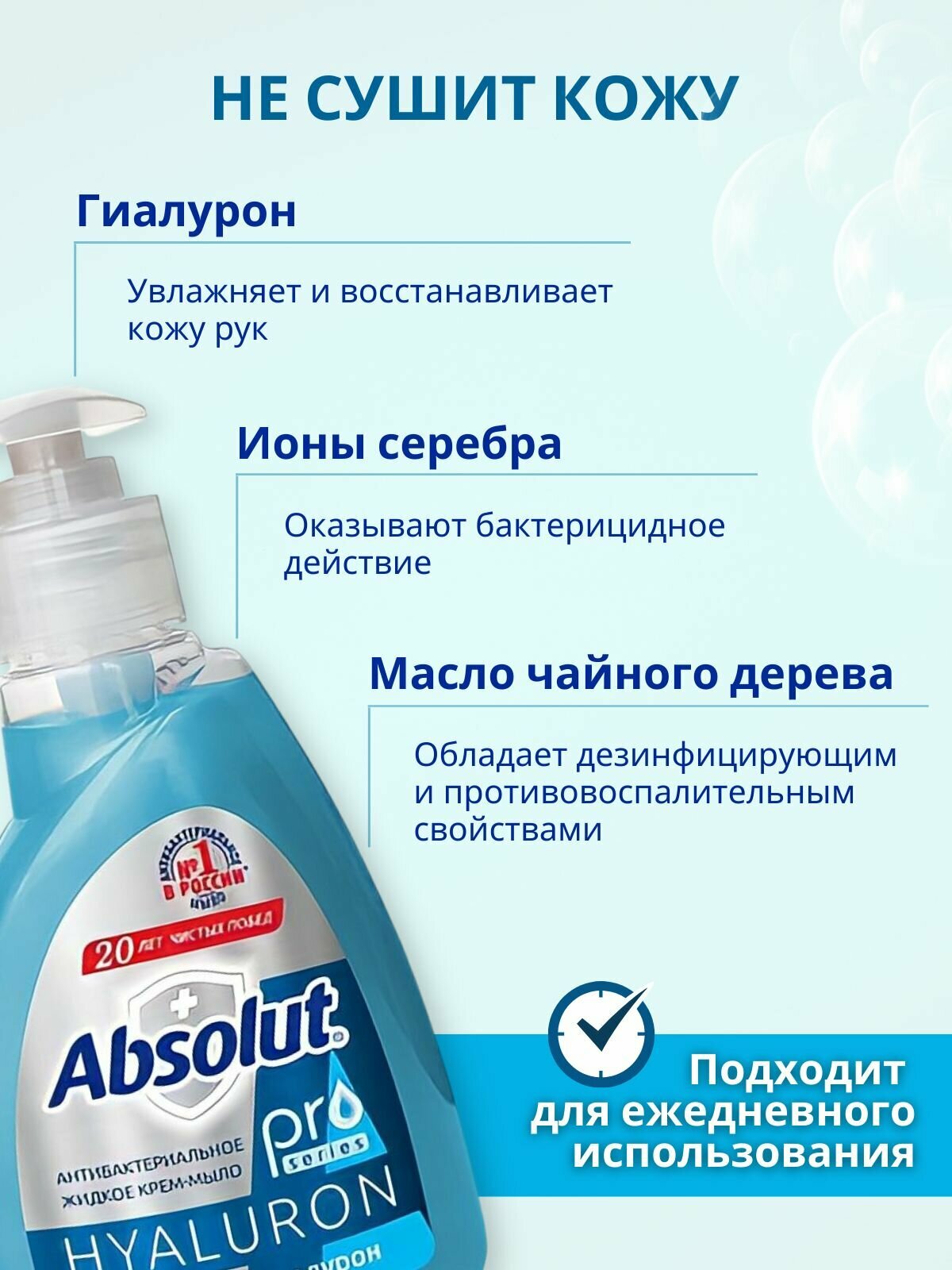 Антибактериальное жидкое крем-мыло Absolut Pro с гиалуроном содержит новую антибактериальную формулу: масло чайногодерева и ионы серебра. Компоненты надёжно защищают кожу от вредоносных бактерий. А гиалурон в составе увлажняет и восстанавливает кож рук. Идеально подходит для повседневного использования.