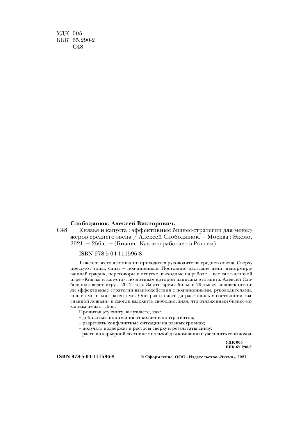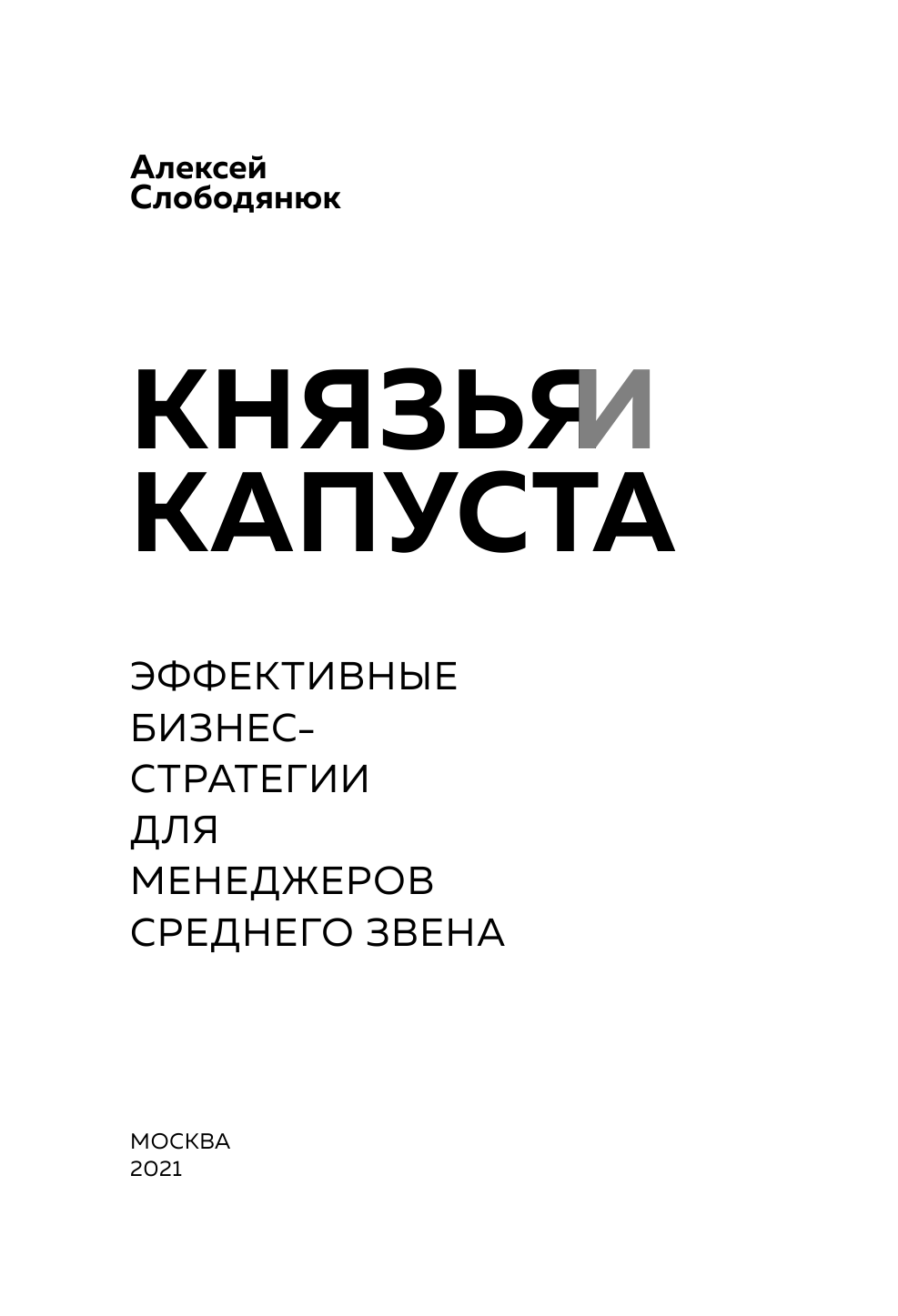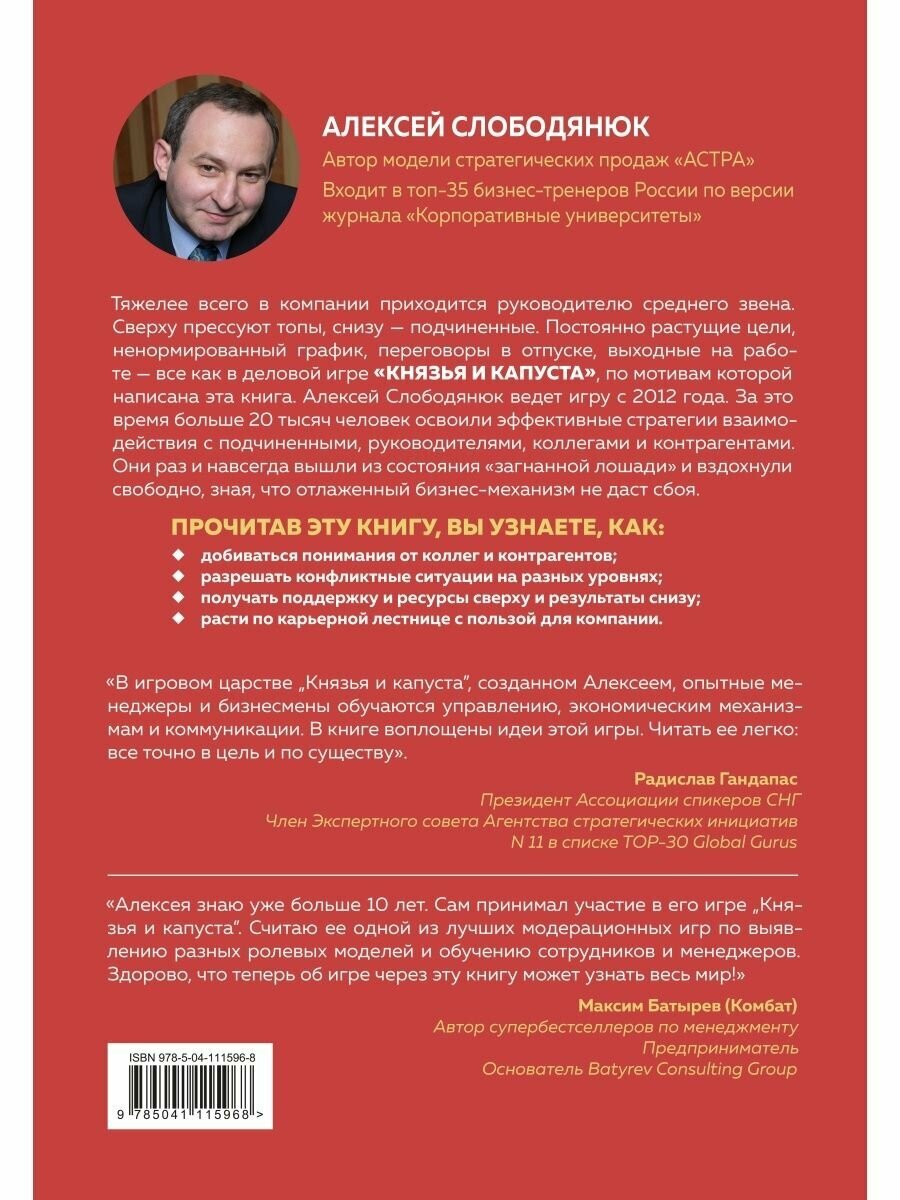 Тяжелее всего в компании приходится руководителю среднего звена. Сверху прессуют топы, снизу - подчиненные. Постоянно растущие цели, ненормированный график, переговоры в отпуске, выходные на работе - все, как в деловой игре "Князья и капуста", по мотивам которой написана эта книга. Алексей Слободянюк ведет игру с 2012 года. За это время больше 20 тысяч человек освоили эффективные стратегии взаимодействия с подчиненными, руководителями, коллегами и контрагентами. Они раз и навсегда расстались с состоянием "загнанной лошади" и смогли вздохнуть свободно, зная, что отлаженный бизнес-механизм не даст сбоя.