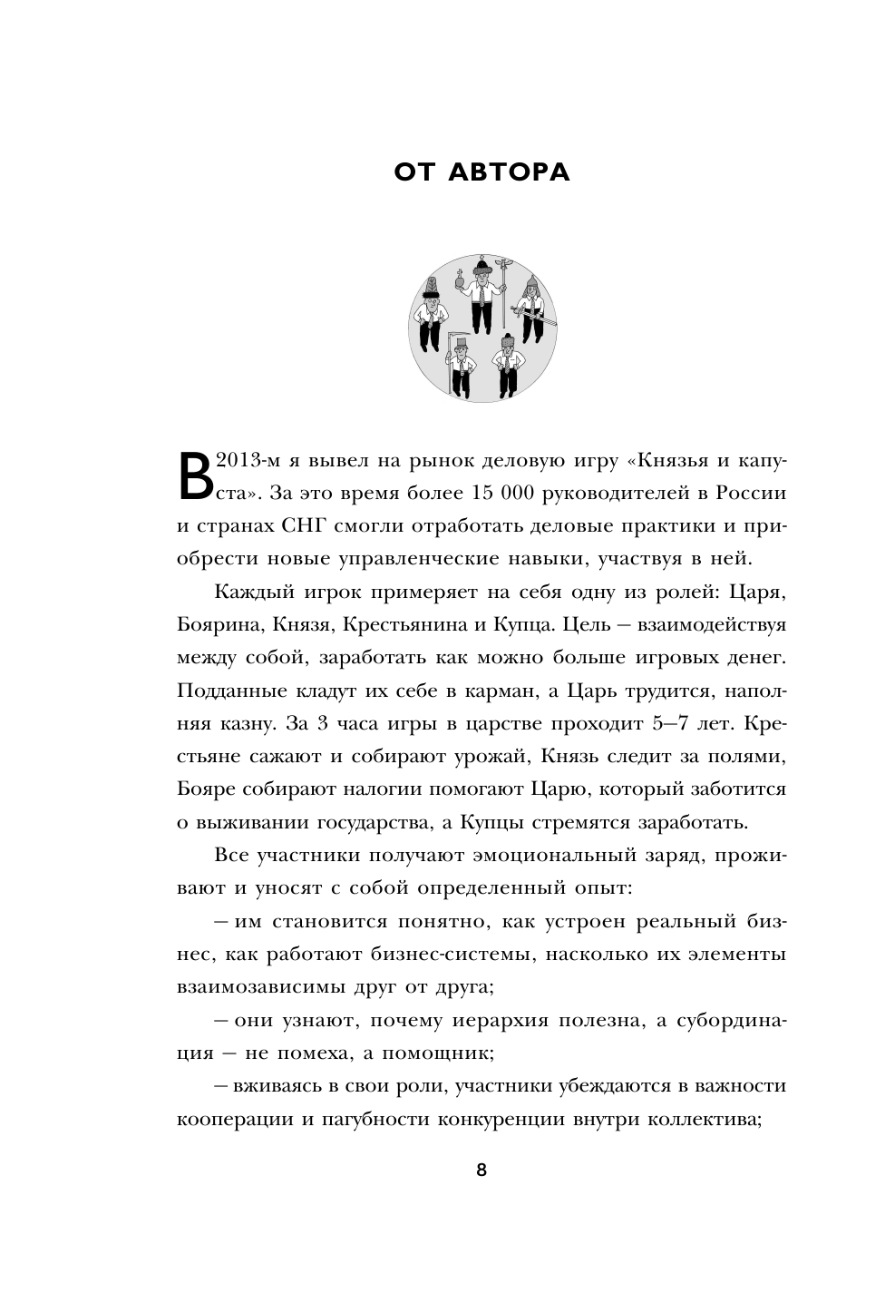 Отличная книга. Несколько лет назад я принял участие в игре «Князья и капуста» в рамках одного из авторских тренингов А. Слободянюка. Очень интересная и умная игра. Теперь с удовольствием прочитал книгу. Она написана легким языком, ярко, со множеством примеров, как из игровых ситуаций так и из реальной жизни. Автор дает простые, действенные механизмы, которые позволят добиться целей и в работе и в жизни в целом. Автор действительно говорит просто и доступно о сложном и важном. Рекомендую к прочтению.