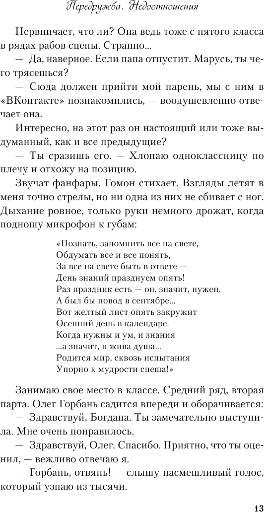 Очень легкая, милая и забавная история любви, которая будет очень знакомой для подростков и вызовет улыбку у более старших читателей, которые с помощью неё вновь окажутся в школе за партой в окружении сплетниц-подружек и вечно недовольных учителей.