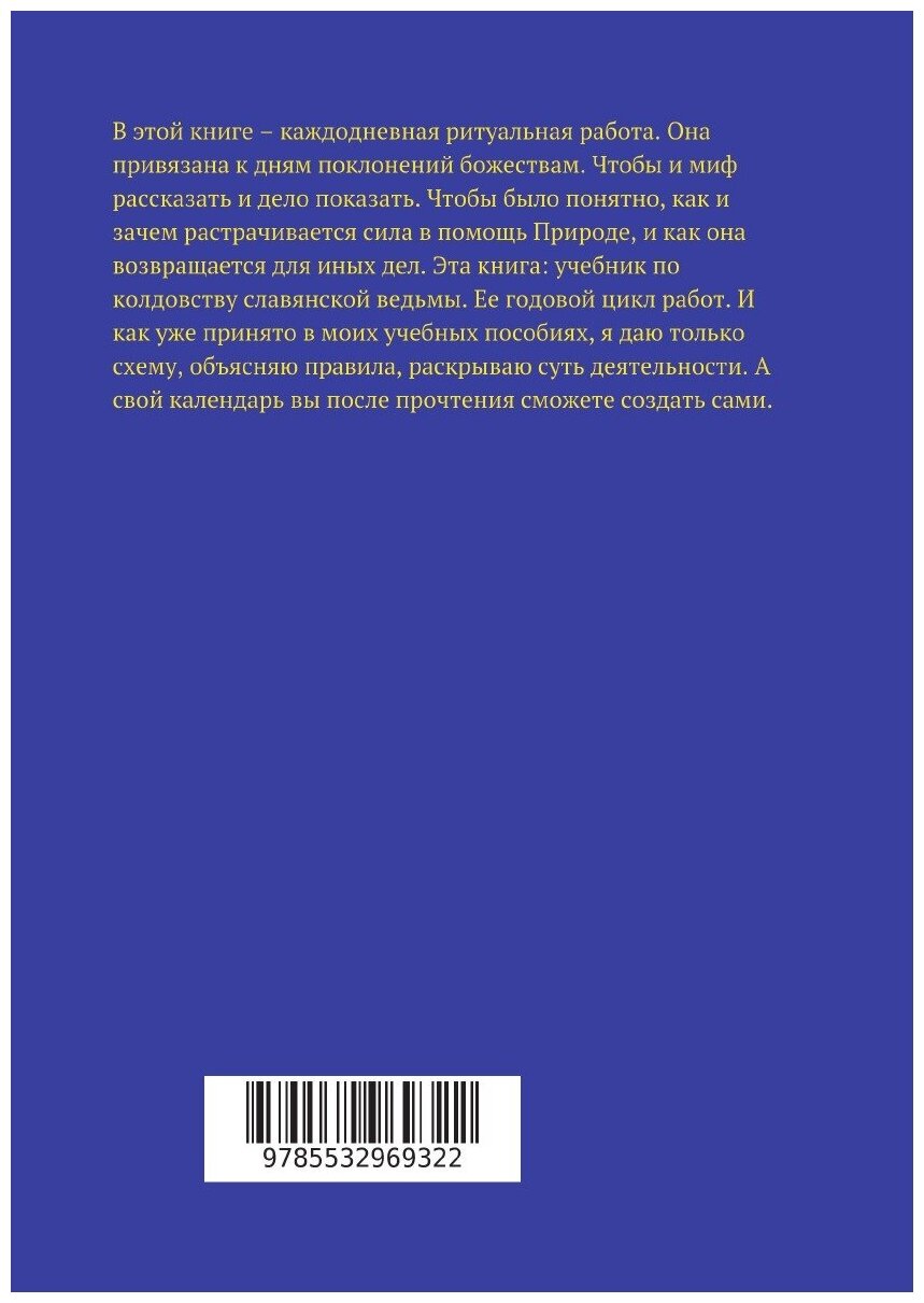 В этой книге – каждодневная ритуальная работа. Она привязана к дням поклонений божествам. Чтобы и миф рассказать и дело показать. Чтобы было понятно, как и зачем растрачивается сила в помощь Природе, и как она возвращается для иных дел. Эта книга: учебник по колдовству славянской ведьмы. Ее годовой цикл работ. И как уже принято в моих учебных пособиях, я даю только схему, объясняю правила, раскрываю суть деятельности. А свой календарь вы после прочтения сможете создать сами.