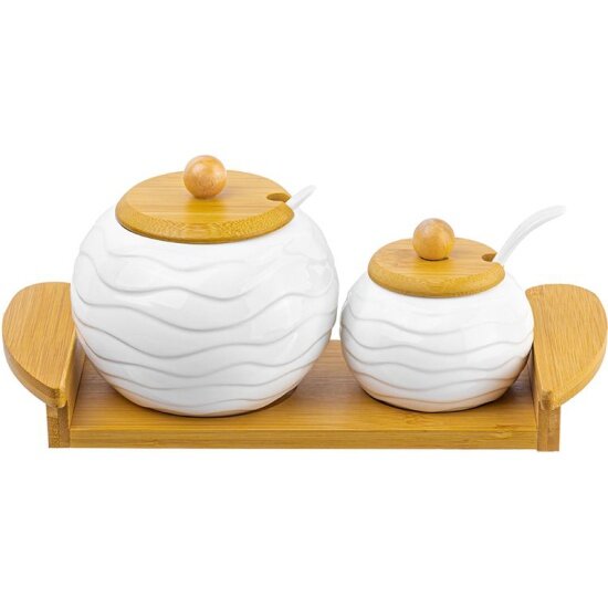 Набор серии "Айсберг" состоит из сахарницы объемом 550 мл и солонки объемом 170 мл с ложками на деревянной подставке. Набор подходит для использования под сахар и соль, мед и варенье, специи, соусы и другие продукты. Подставка имеет ручки, благодаря чему набор можно удобно переносить и подавать к столу. Набор выполнен из высококачественного фарфора и натурального бамбука. Сахарница и солонка украшены рельефными орнаментами. Фарфоровые детали набора можно использовать в микроволновой печи и посудомоечной машине. Размер набора 27х11,5х12 см. Поставляется в яркой картонной упаковке. Сахарница и солонка из серии посуды "Айсберг" сможет стать настоящим украшением кухни или приятным подарком для ваших родных и близких!
